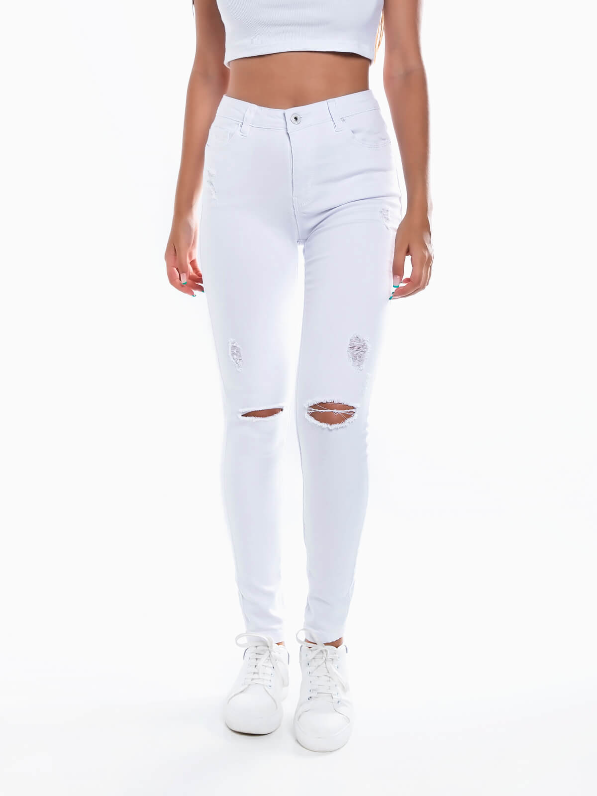 Calças de sarja brancas com rasgos para senhora. Calças justas de cintura alta elástica. 5 bolsos. Aperto fecho éclair e botão.