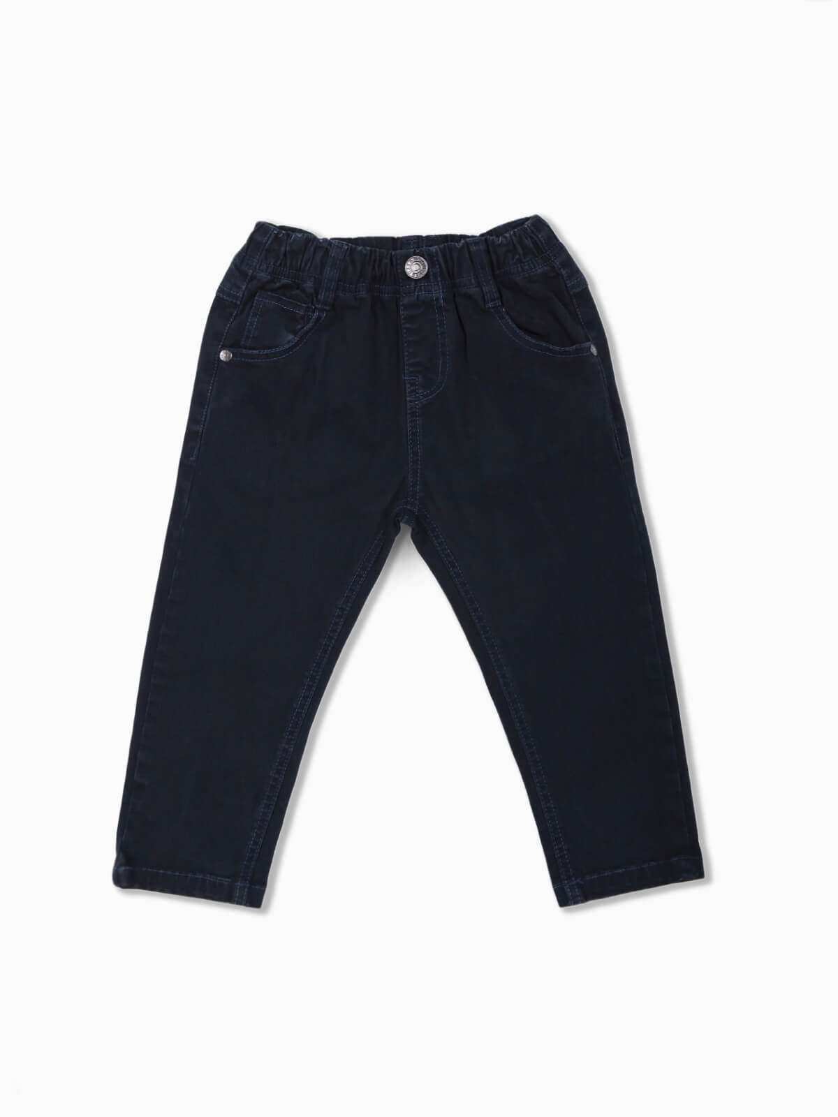 Calças sarja azul marinho de cintura elástica para bebé menino. Calças com 5 bolsos. Botão decorativo.