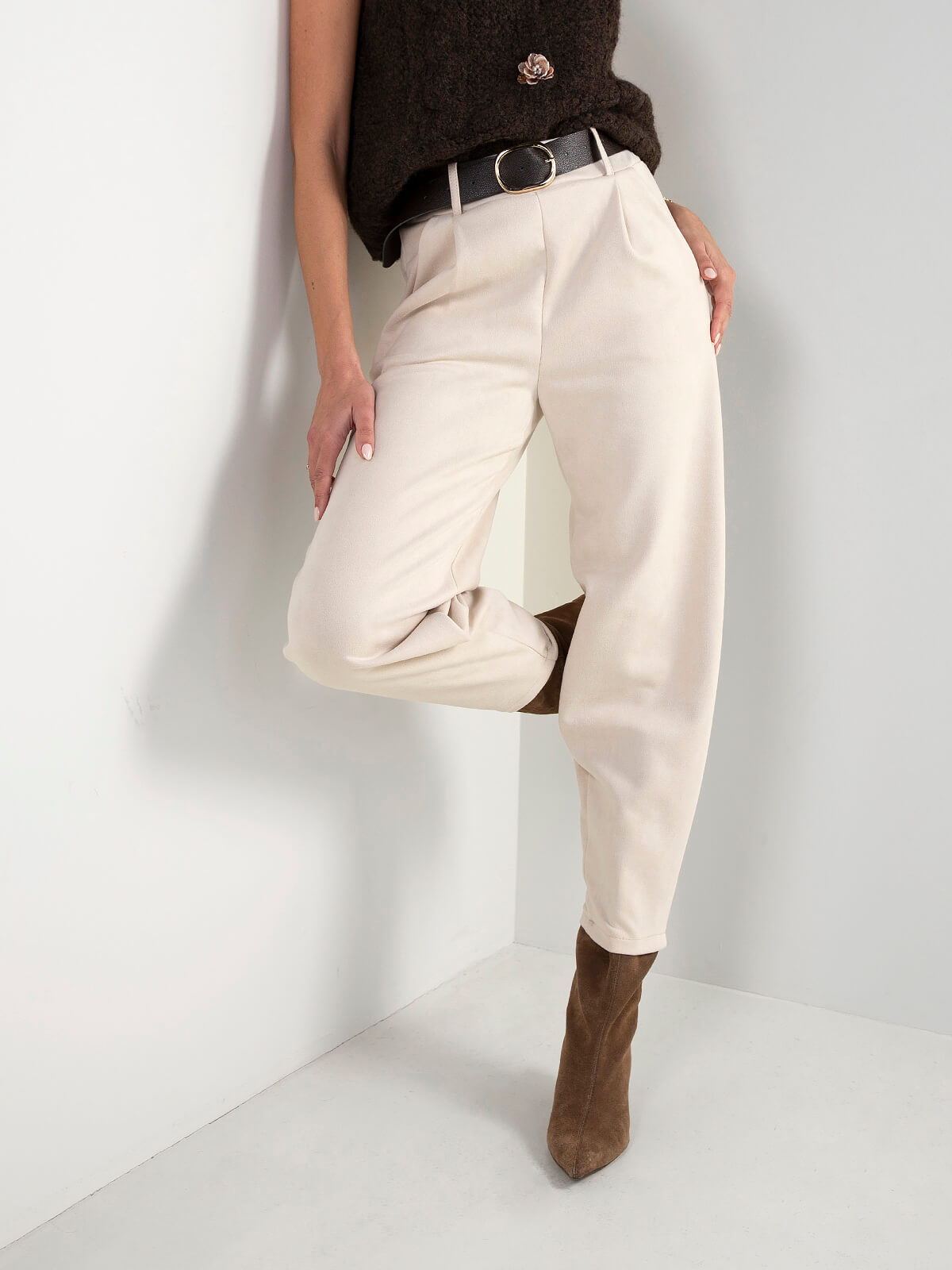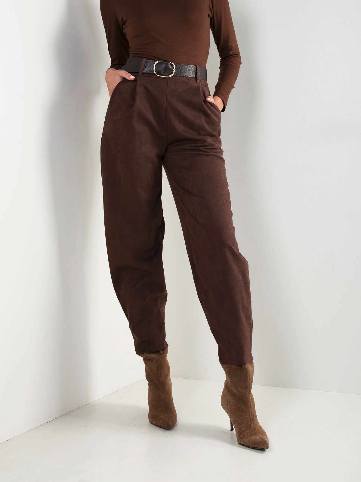 Calças de senhora em tecido efeito camurça, de toque suave e acabamento elegante. Modelo de cintura alta, com perna afunilada e bolsos laterais. Cinto incluído.