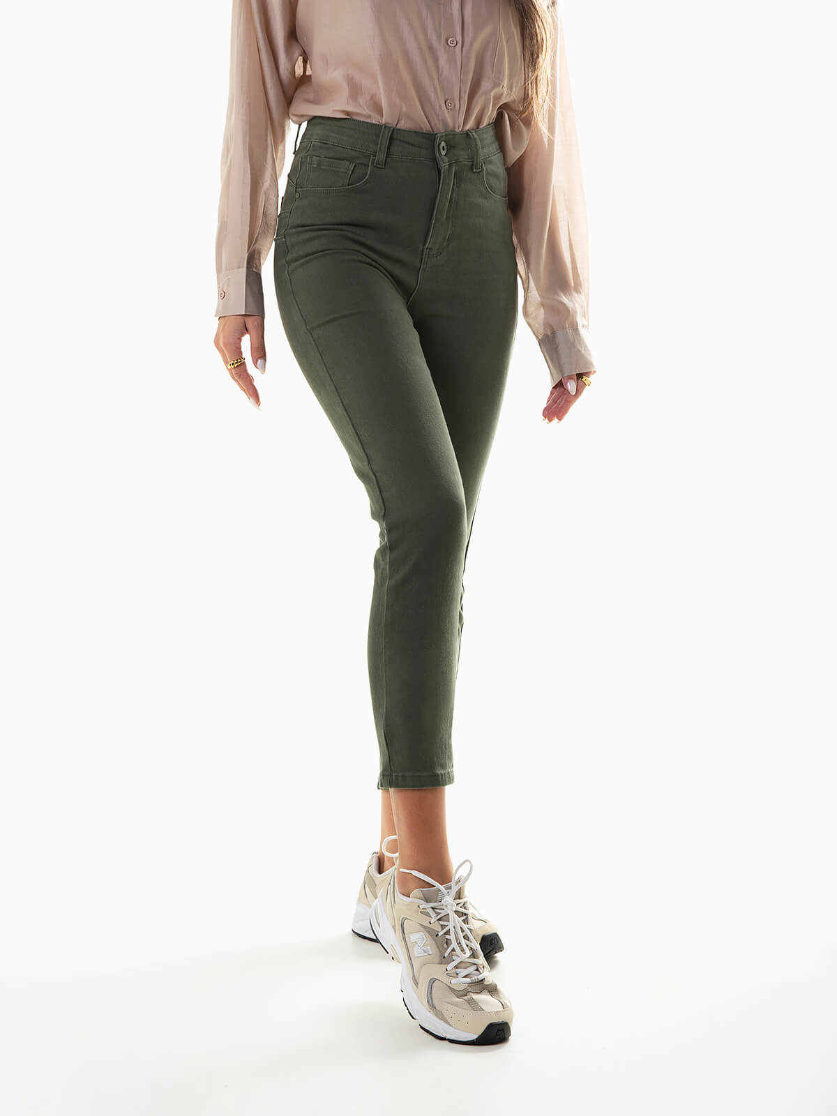 Calças verde tropa com efeito push-up, super confortáveis e que elevam a confiança. Calças ganga elástica de cintura alta com 5 bolsos. Aperto fecho éclair e botão.