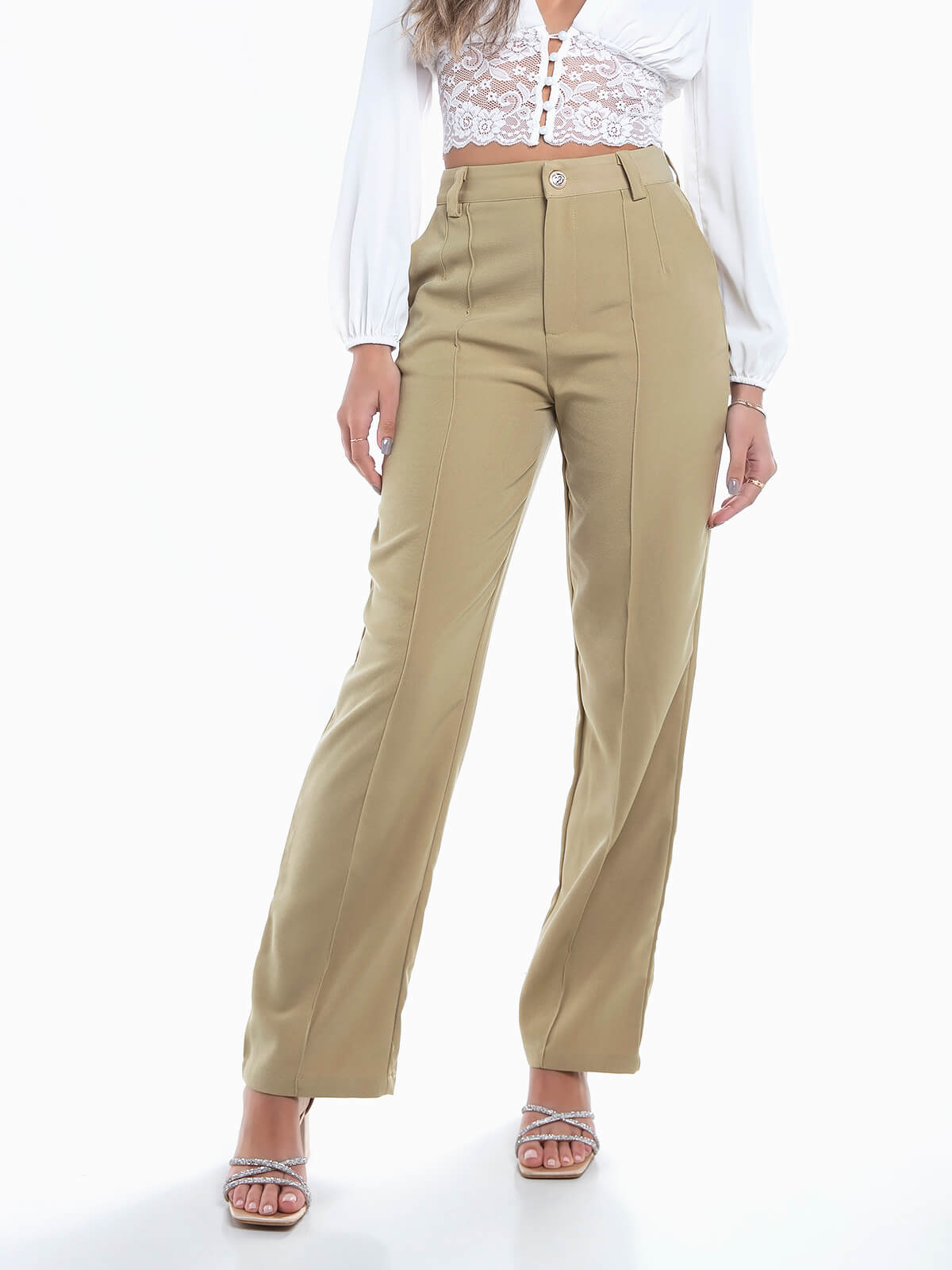 Calças verdes straight fit para senhora. Calças clássicas e elegantes com costura reforçada à frente. Cintura alta. 2 bolsos. Aperto de fecho éclair e botão.