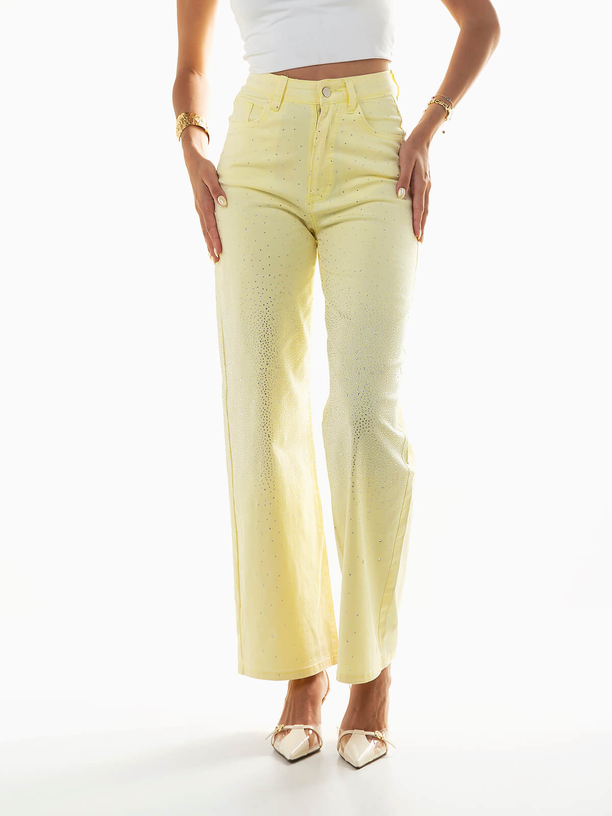 Calças wide leg amarelas com strass para efeito brilhante. Calças de sarja com cintura alta e 5 bolsos. Aperto de fecho éclair e botão.