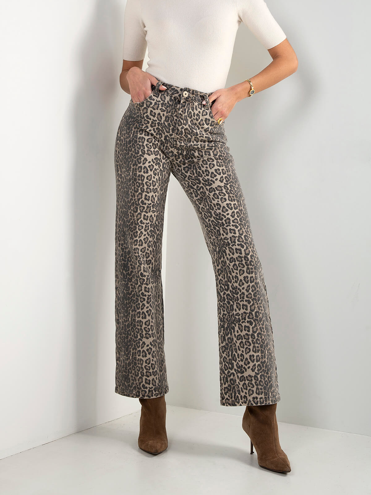 Calças de ganga cintura alta em animal print, com corte direito e largo. 5 bolsos. Um modelo atual que conjuga tendência e versatilidade, ideal para looks urbanos ou mais elegantes. Confortáveis e fáceis de combinar, adaptam-se do dia a dia a ocasiões especiais.