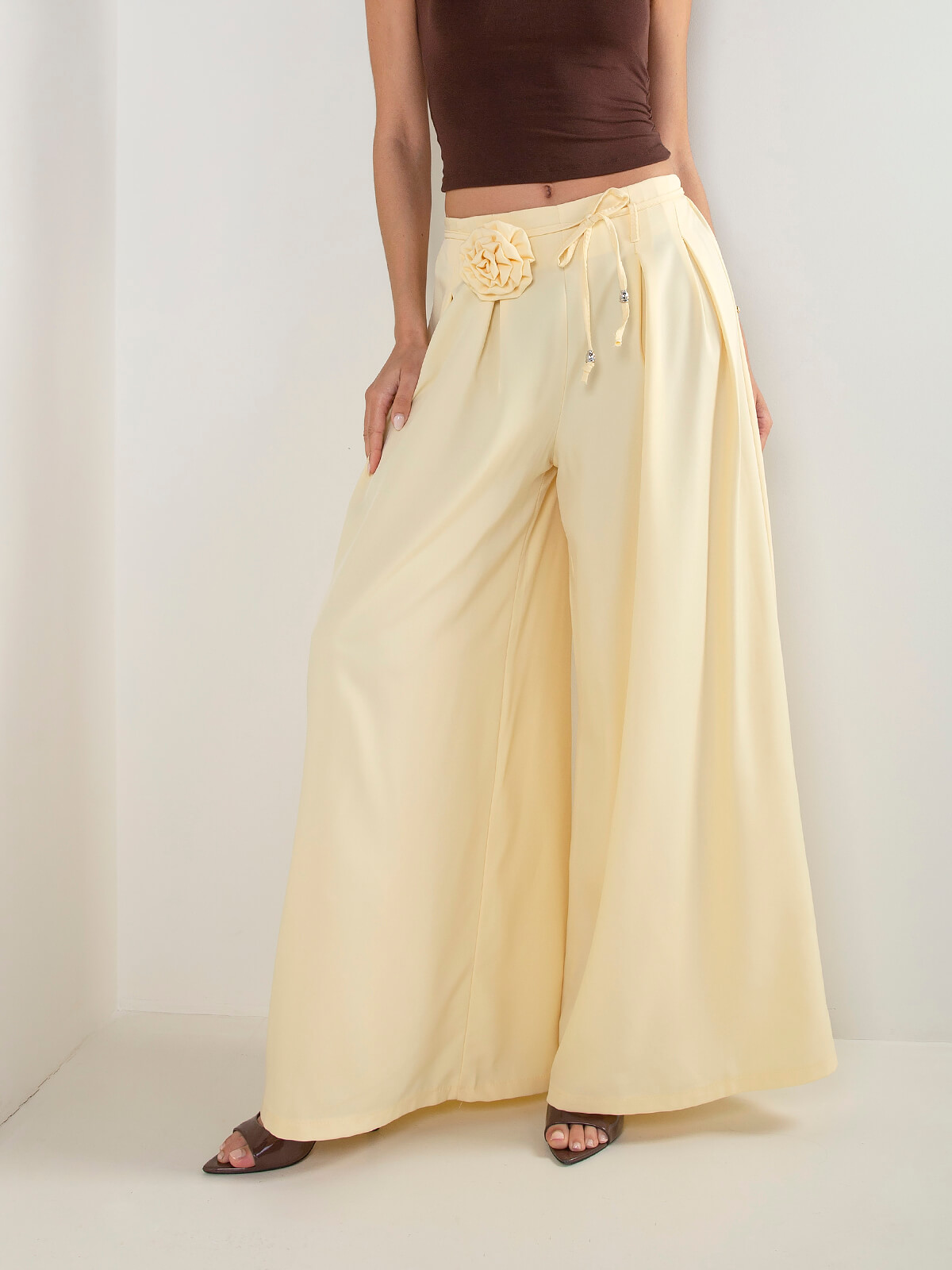 Início Mulher Calças Calças wide leg com pregas e flor