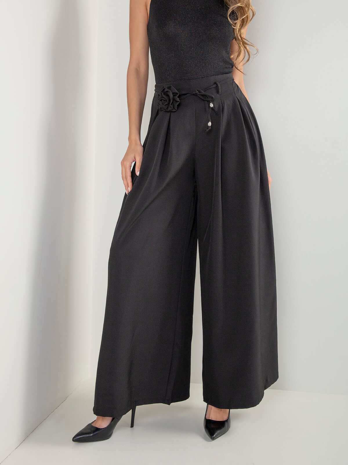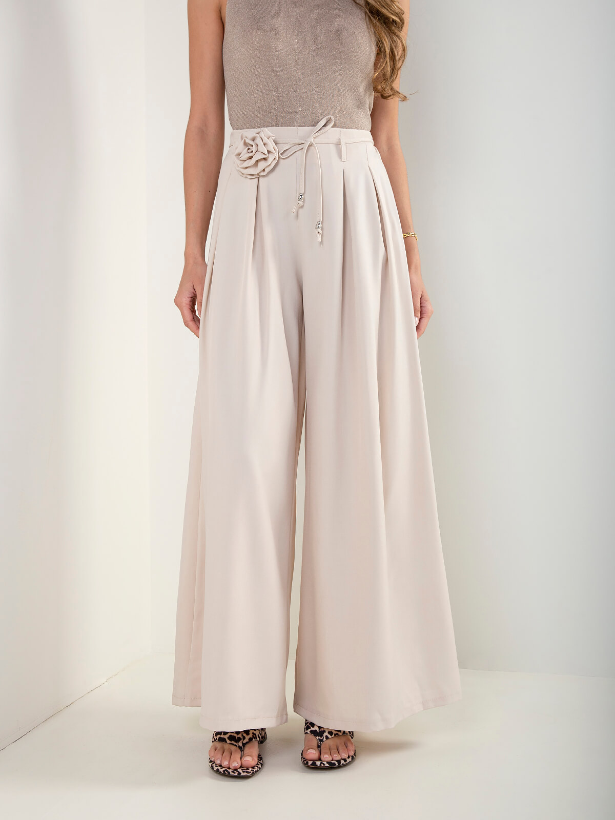 Calças wide leg com pregas e flor