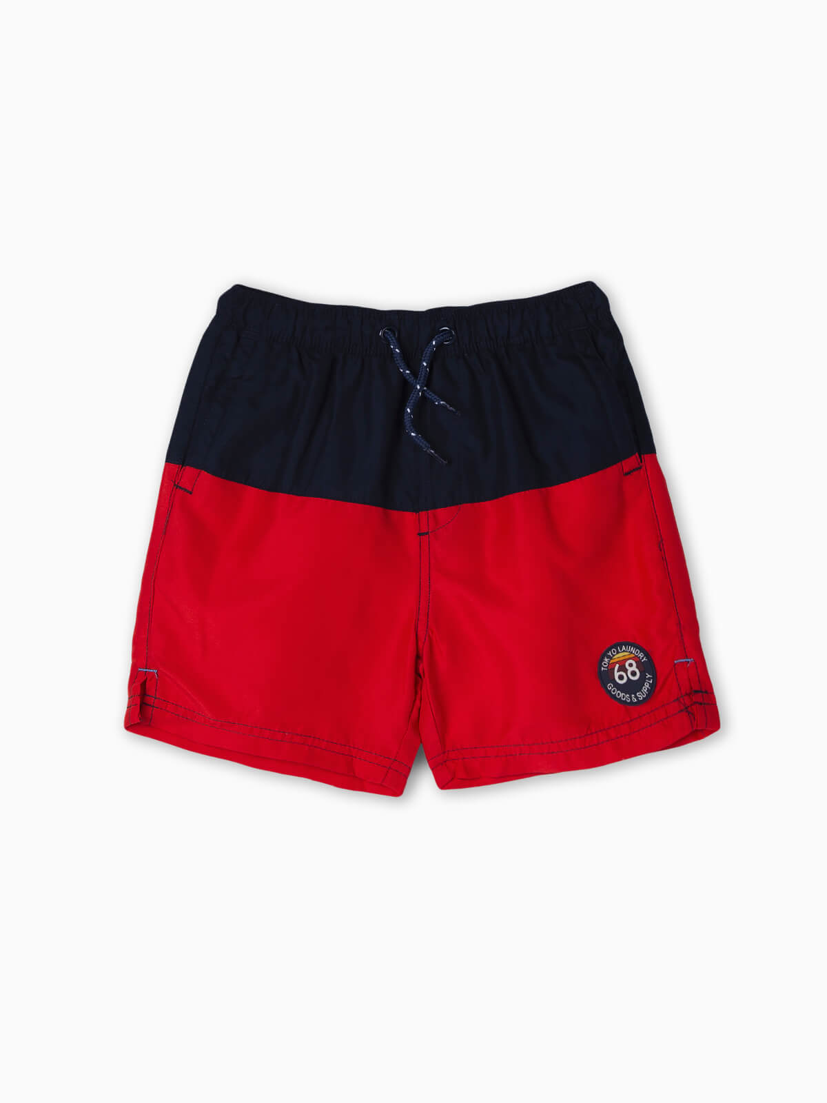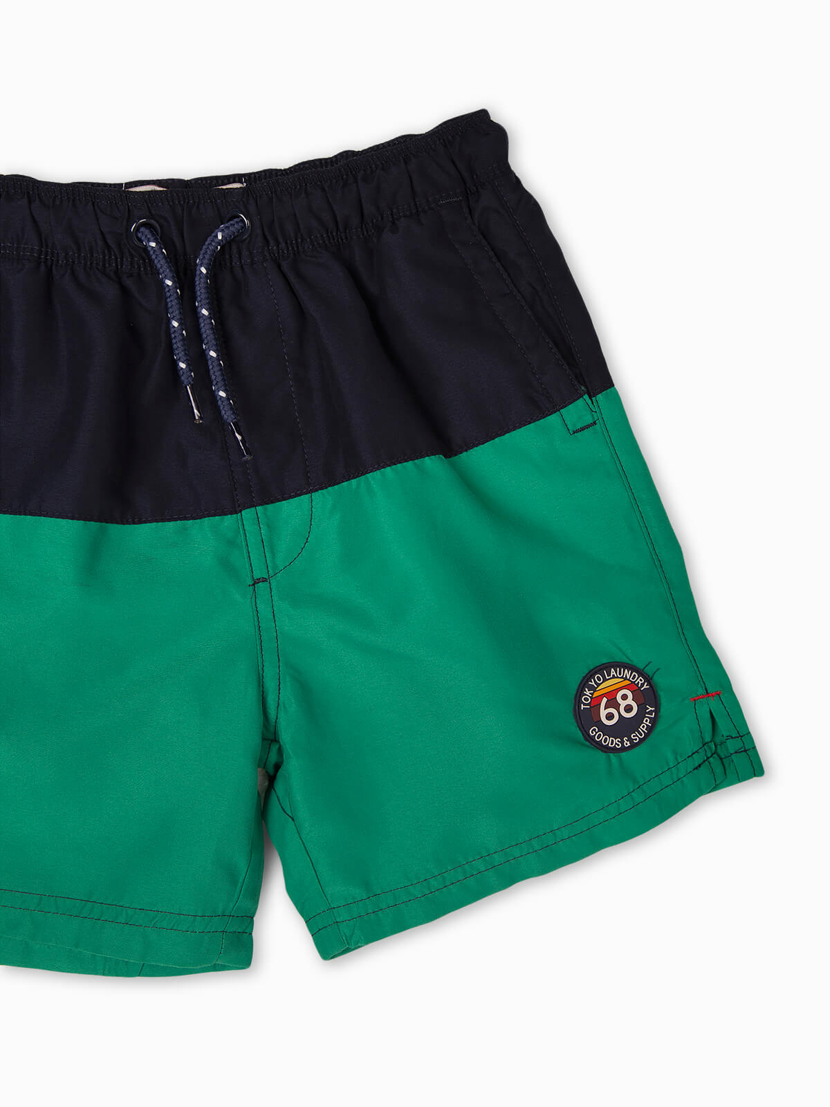 Calções de banho bicolores para menino. Calções em tecido leve de secagem rápida com cintura elástica e cordão para ajustar. 2 bolsos laterais e atrás com velcro. Forro interior respirável.
