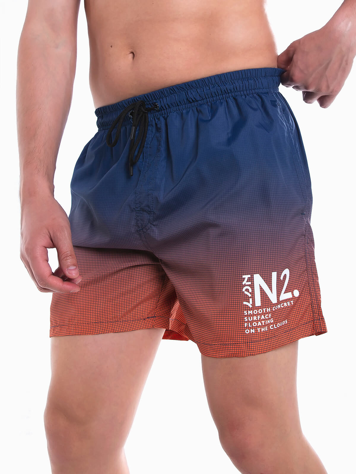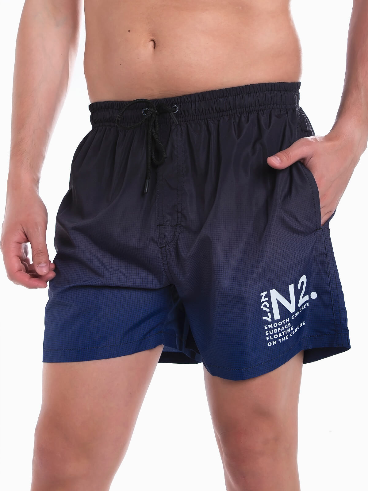 Calções de banho com degradê e letras estampadas. Calções quadradiculados em tecido de secagem rápida com cintura elástica e cordão para ajustar. 2 bolsos laterais e 1 posterior com velcro. Forro interior respirável.
