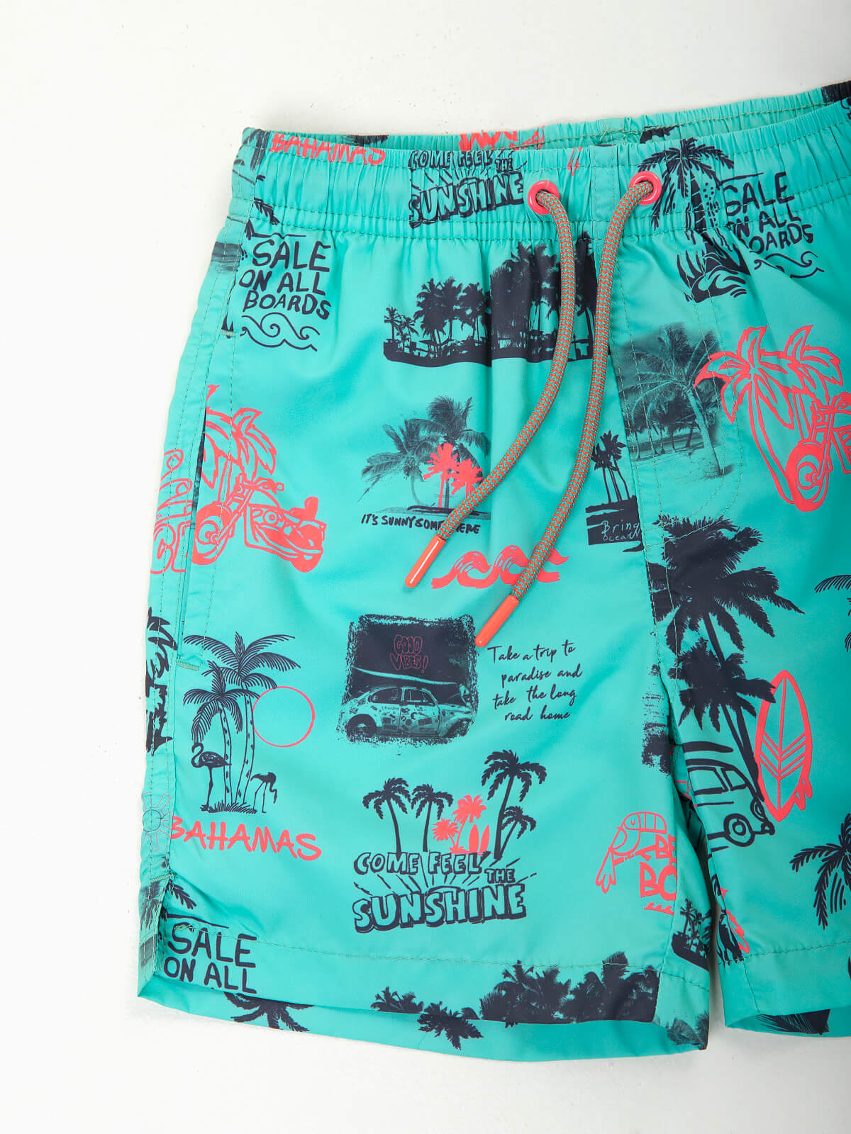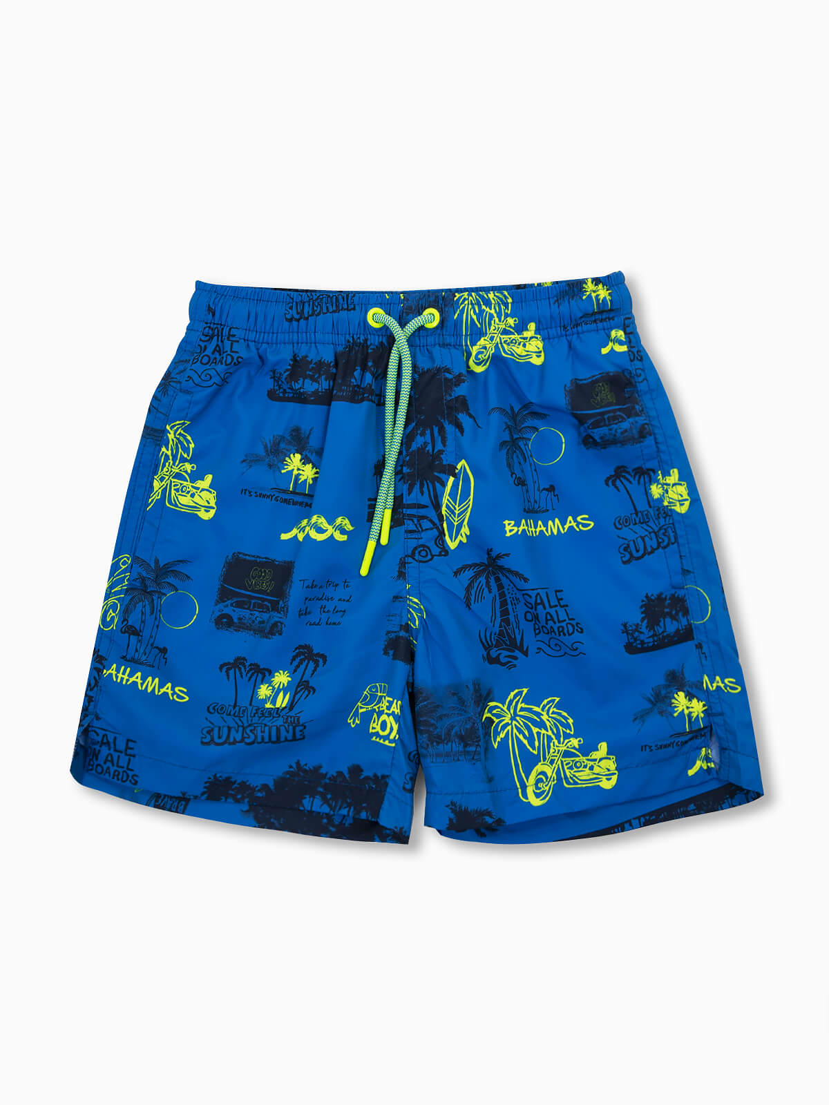 Calções de banho com ilustrações estampadas para menino. Calções com elástico na cintura e cordão para ajustar. Interior forrado. 2 bolsos.