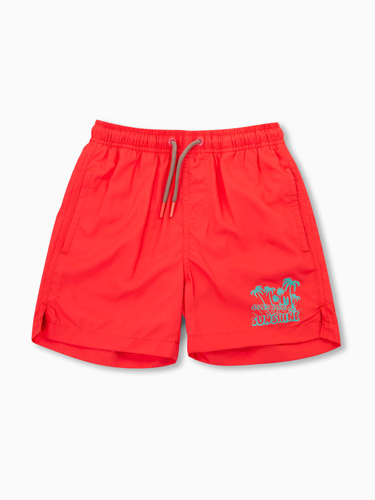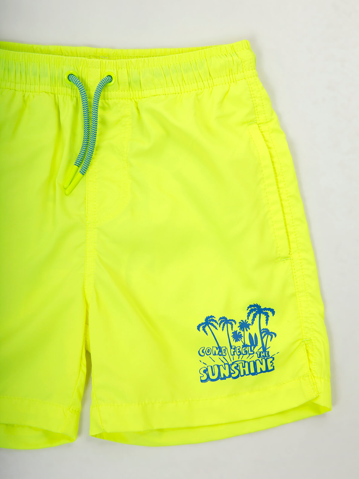 Calções de banho com estampado de palmeiras e letras para menino. Calções com elástico na cintura e cordão para ajustar. Interior forrado. Bolso atrás com velcro.