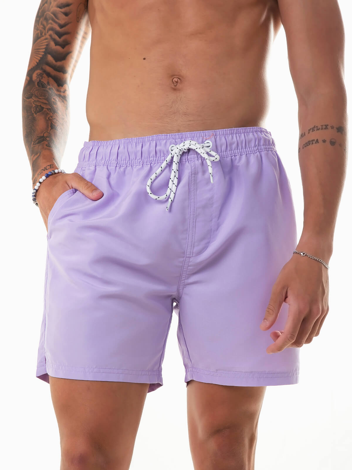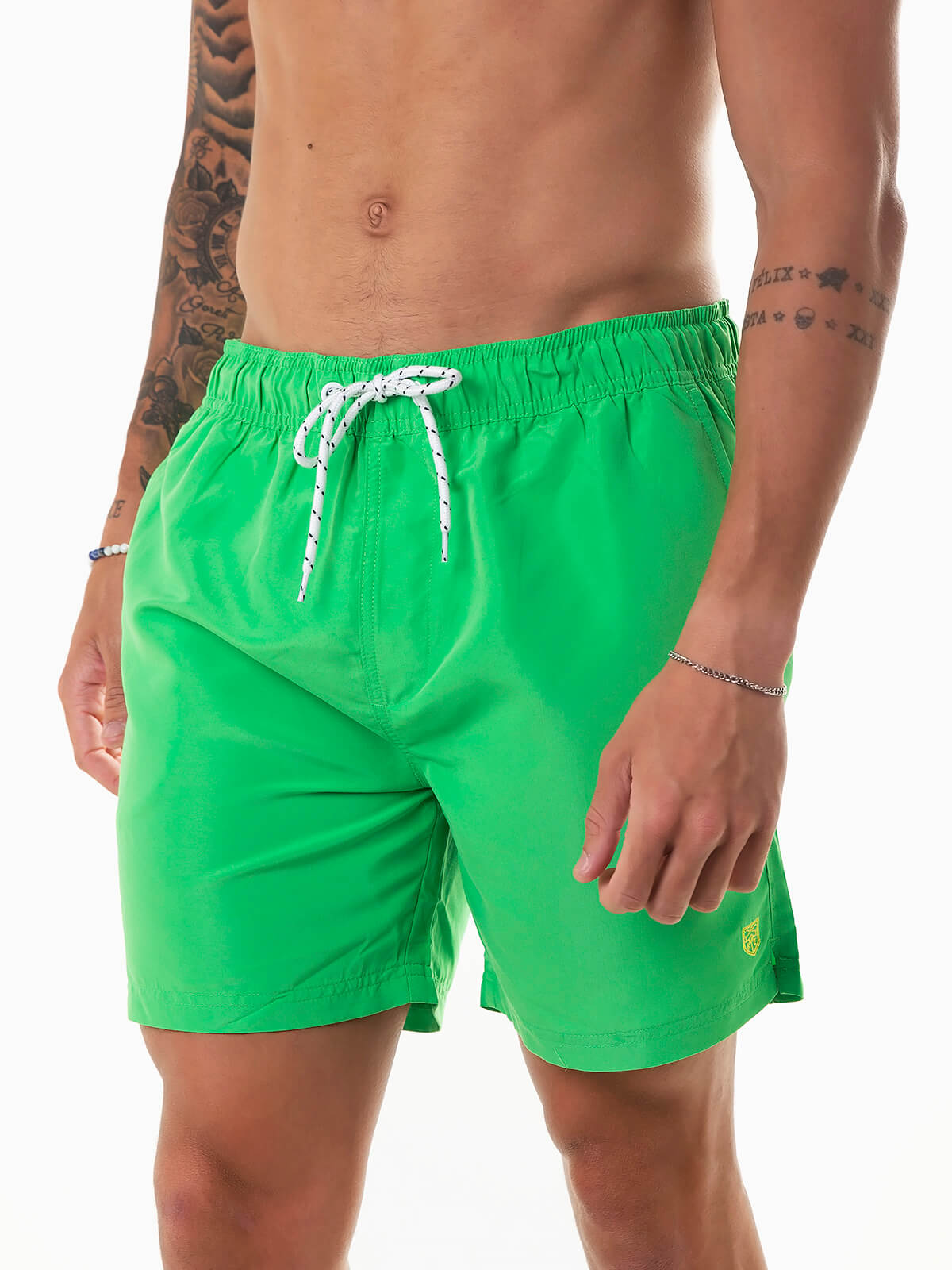Calções de banho lisos com símbolo bordado na base. Calções em tecido de secagem rápida com cintura elástica e cordão para ajustar. 2 bolsos laterais, 1 interior e 1 na parte posterior com velcro. Forro interior respirável.