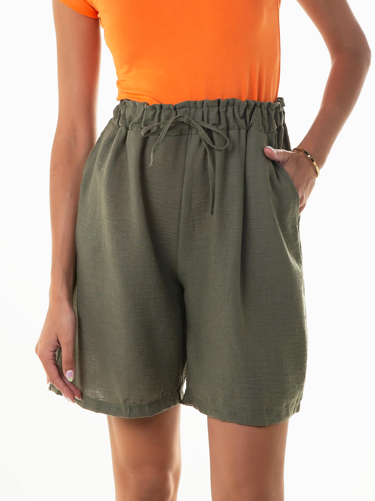 Calções bermuda confecionados em tecido mistura viscose com aparência linho. Calções fluídos para senhora com cintura alta elástica e cordão para laço. 2 bolsos.