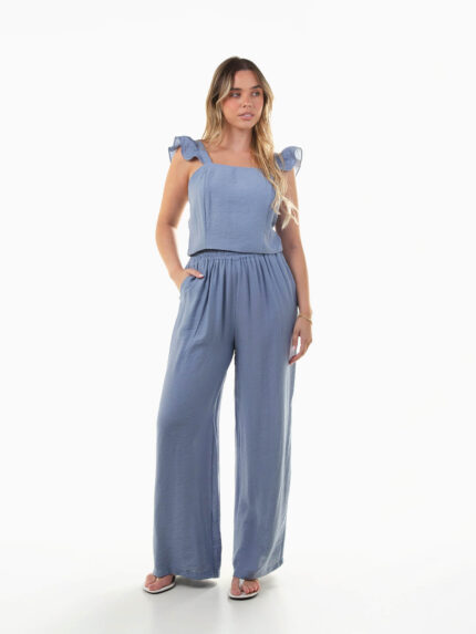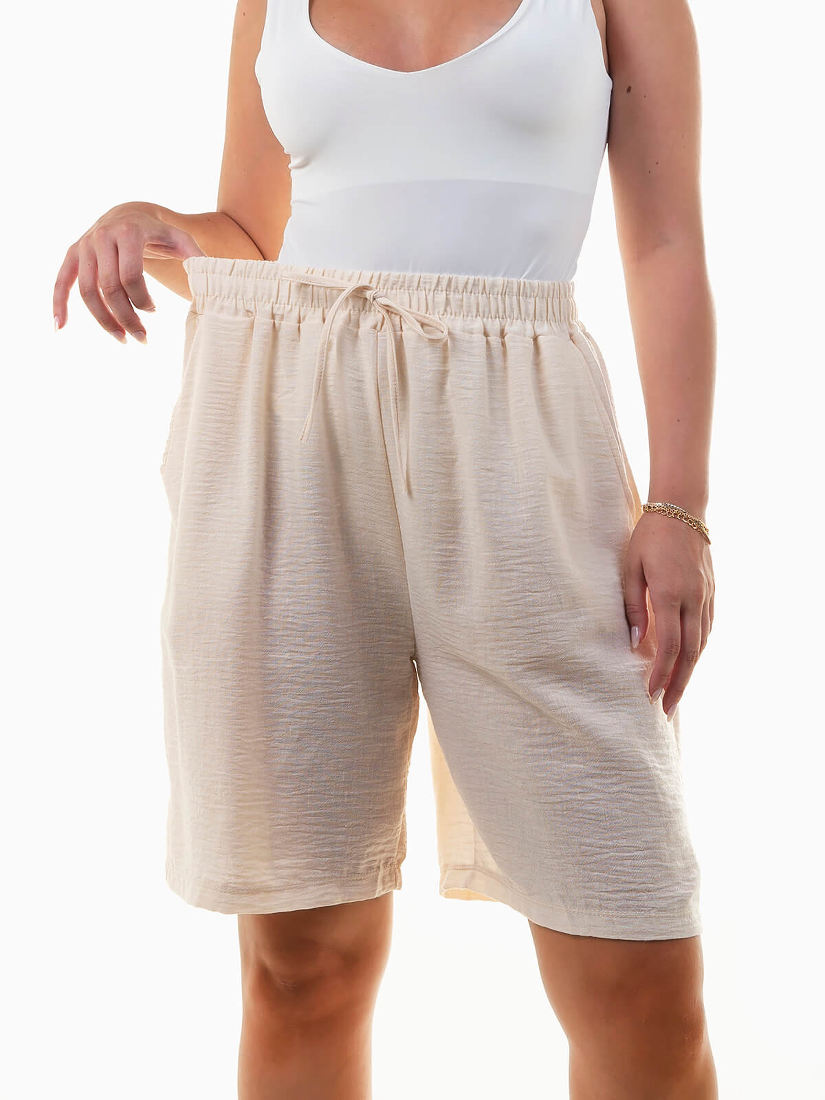 Calções bermuda com cintura alta elástica e cordão para laço. Calções fluídos confecionados em tecido mistura viscose, fresco e confortável. 2 bolsos.