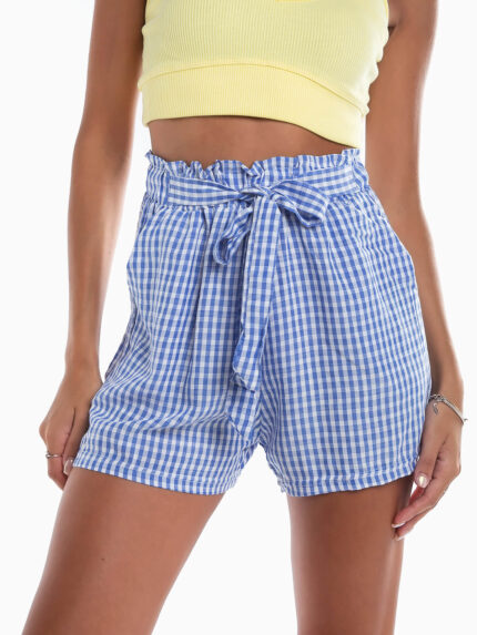 Calções bermuda com cintura alta elástica e cordão para laço. Calções fluídos confecionados em tecido mistura viscose com aparência linho. 2 bolsos.