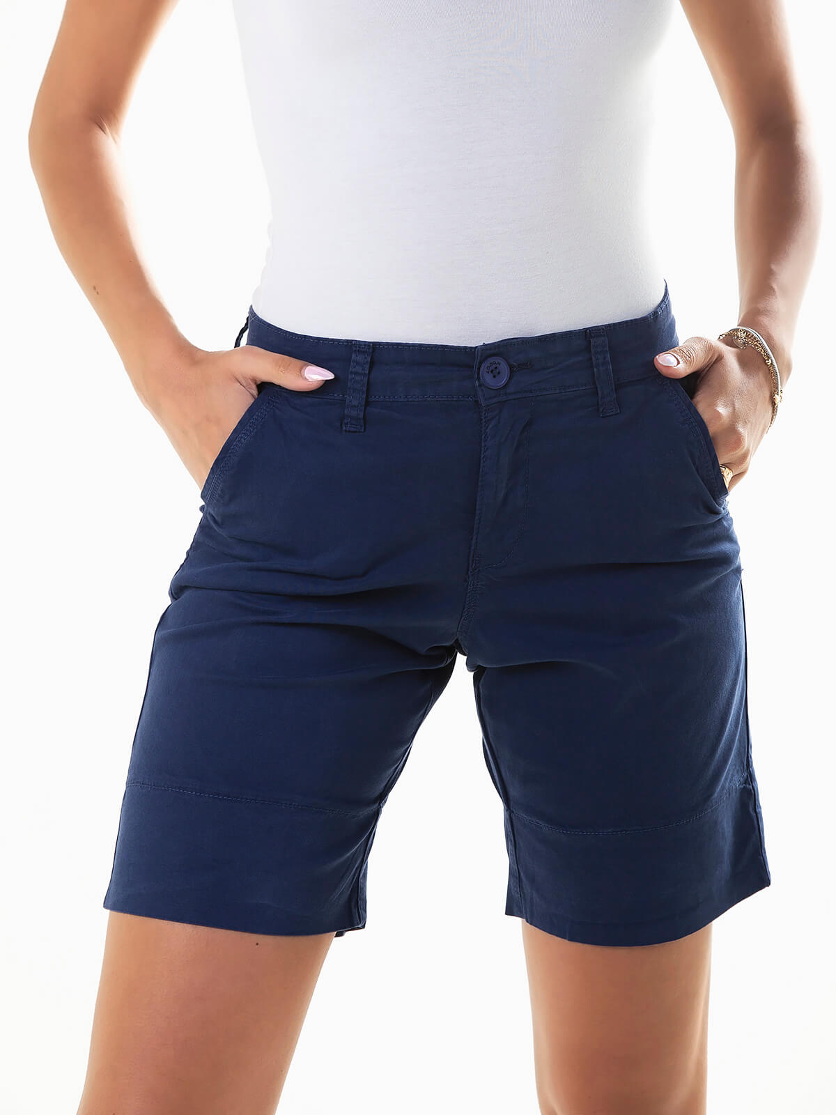 Calções bermuda de sarja para senhora. Calções chino de cintura média com 2 bolsos. Aperto de fecho zíper e botão.