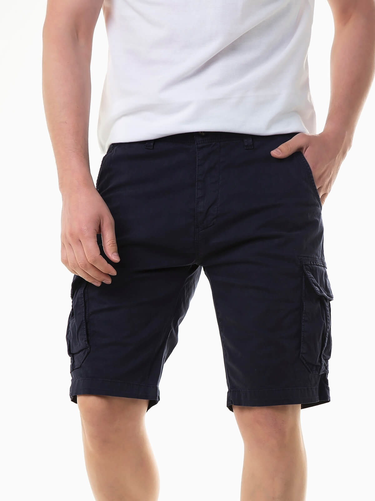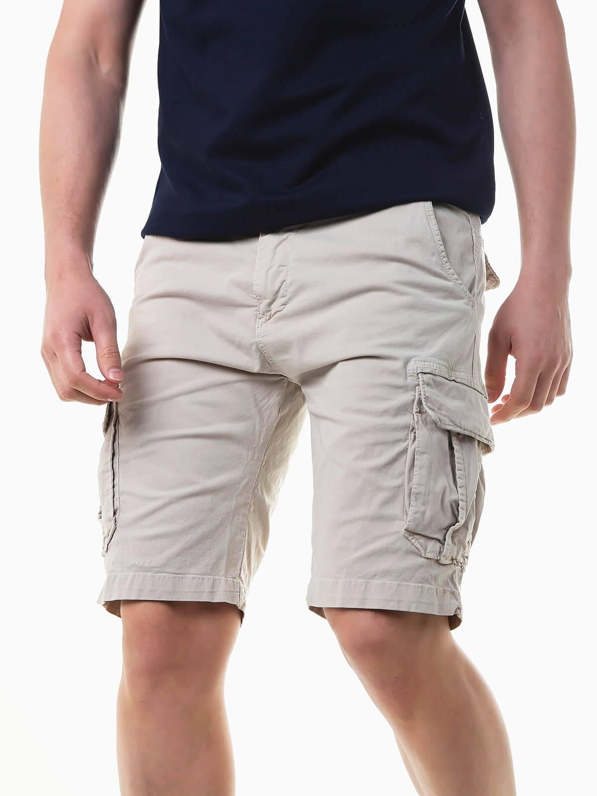 Calções bermuda estilo cargo para homem com 6 bolsos. Calções de sarja com elasticidade. Aperto de fecho zíper e botão.