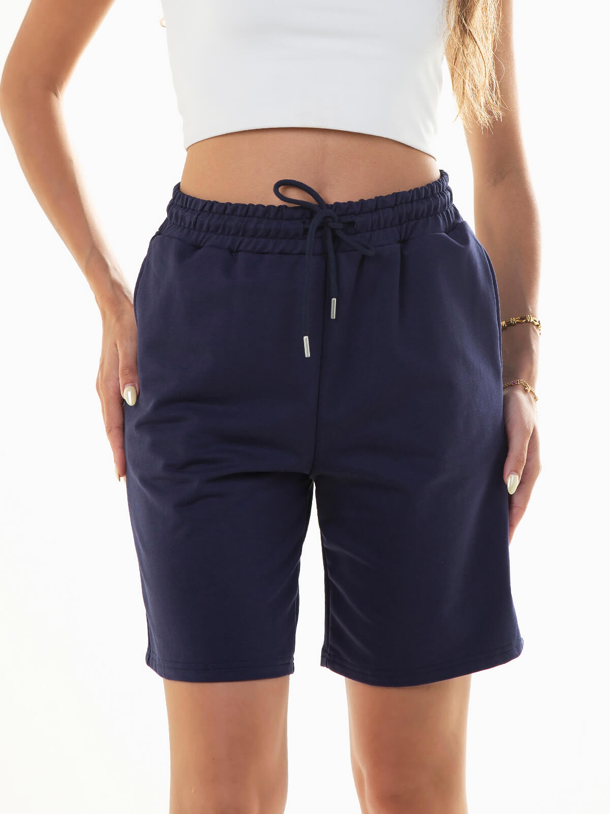 Calções bermuda de fato de treino para senhora. Calções desportivos confortáveis com cintura alta e cordão para ajustar. 2 bolsos.