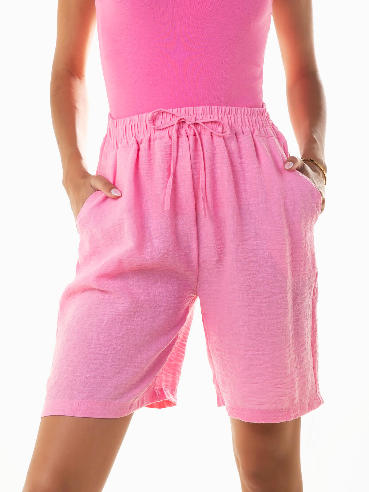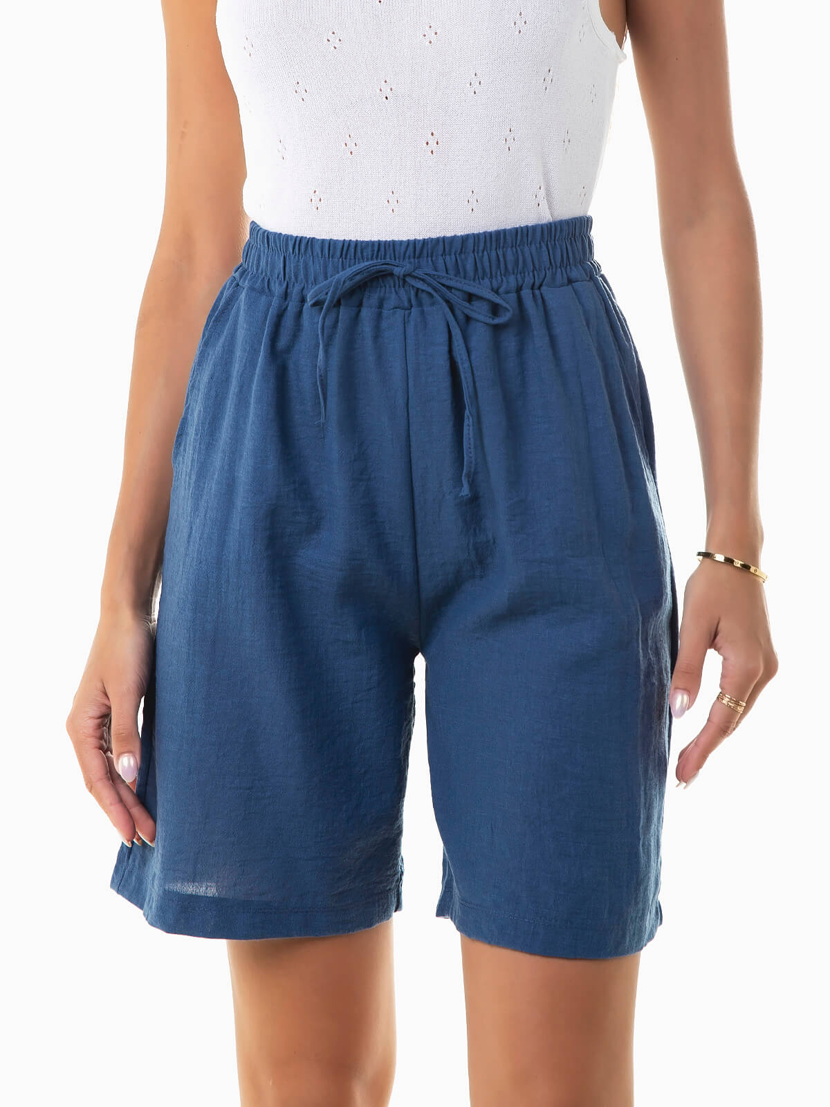 Calções bermuda confecionados em tecido mistura viscose com aparência linho. Calções largos para senhora com cintura alta elástica e cordão para laço. 2 bolsos.