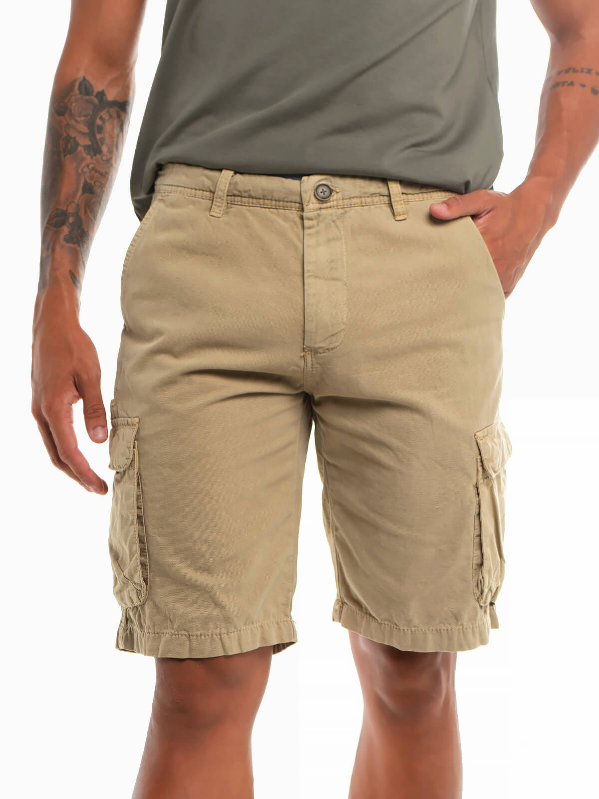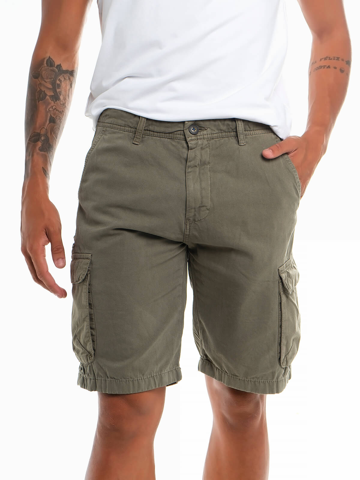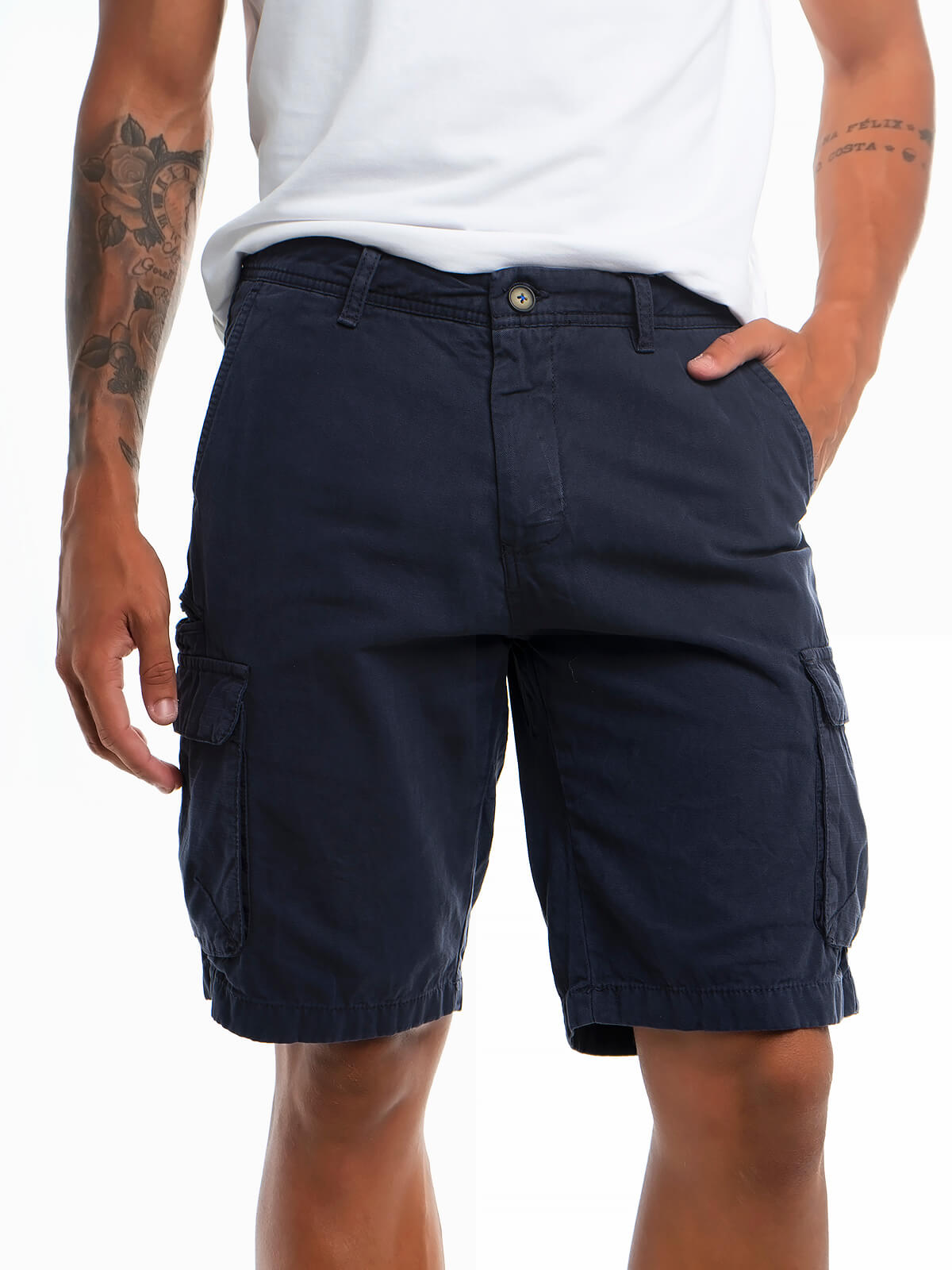 Calções de sarja estilo cargo para homem. Calções chino com 6 bolsos. Aperto de fecho éclair e botão.