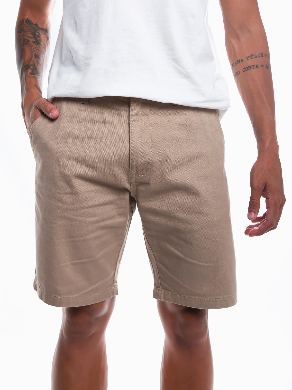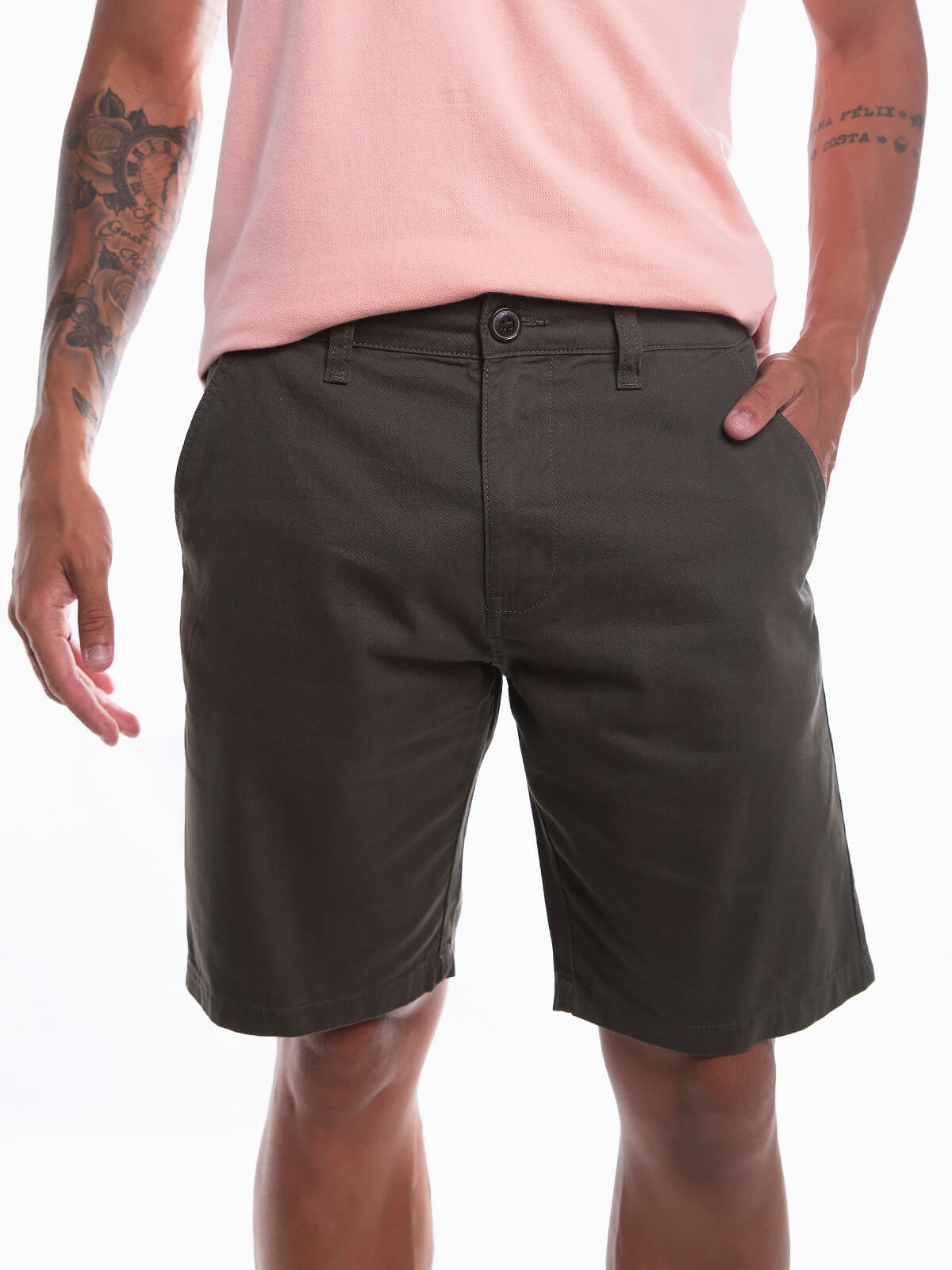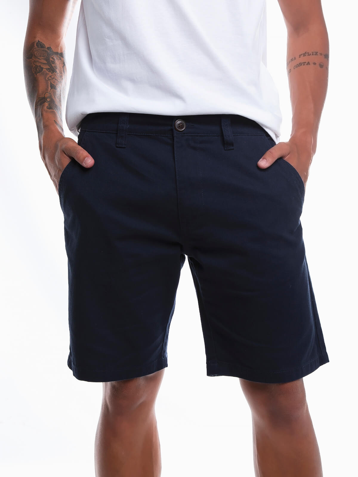Calções chino de sarja 100% algodão para homem. Calções bermuda regular fit com 4 bolsos. Aperto de fecho éclair e botão.