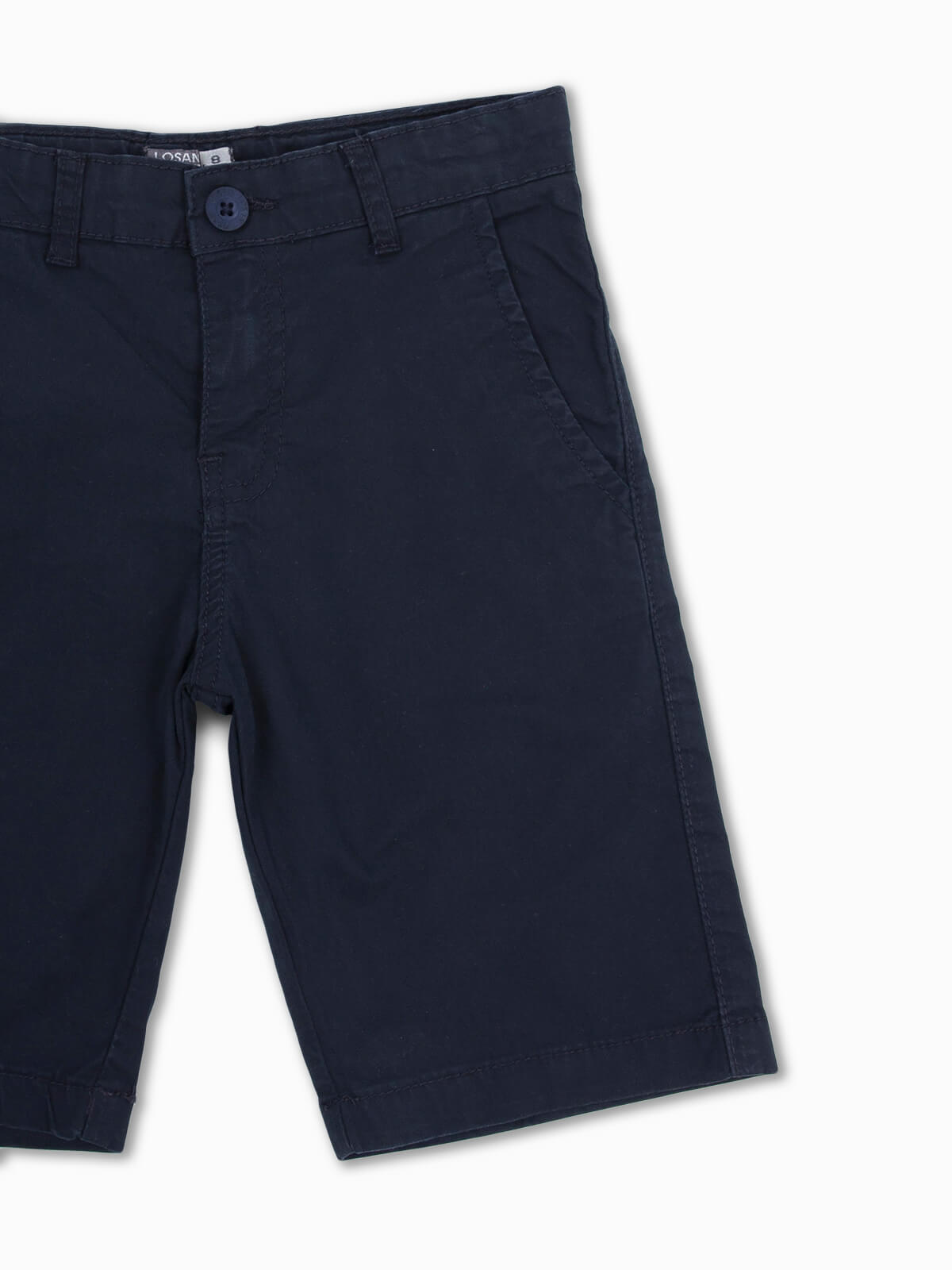 Calções chino de sarja azul marinho para menino. Bermudas com ajustador no interior. 4 bolsos. Aperto de fecho éclair e botão.