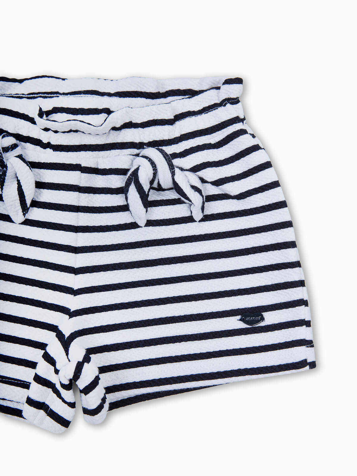 Calções curtos brancas às riscas azuis para bebé menina. Calções em tecido com textura e dois laços aplicados. Cintura elástica.