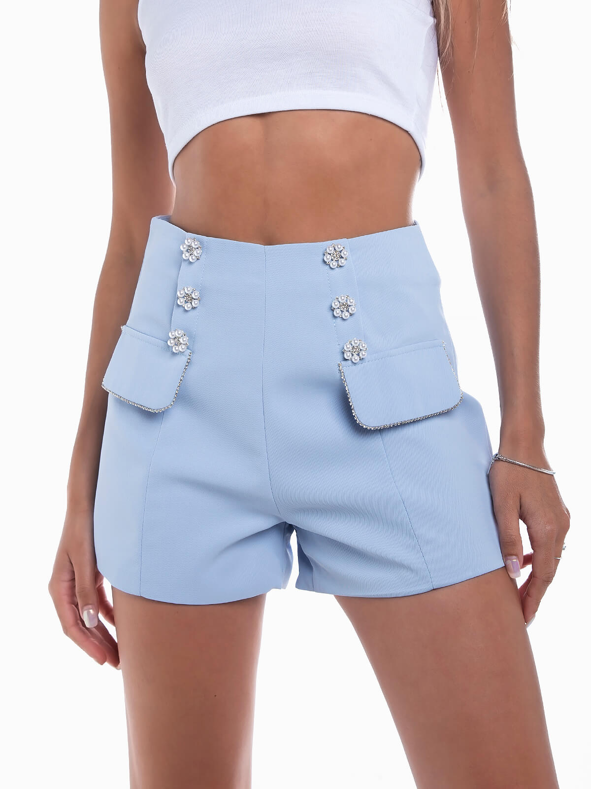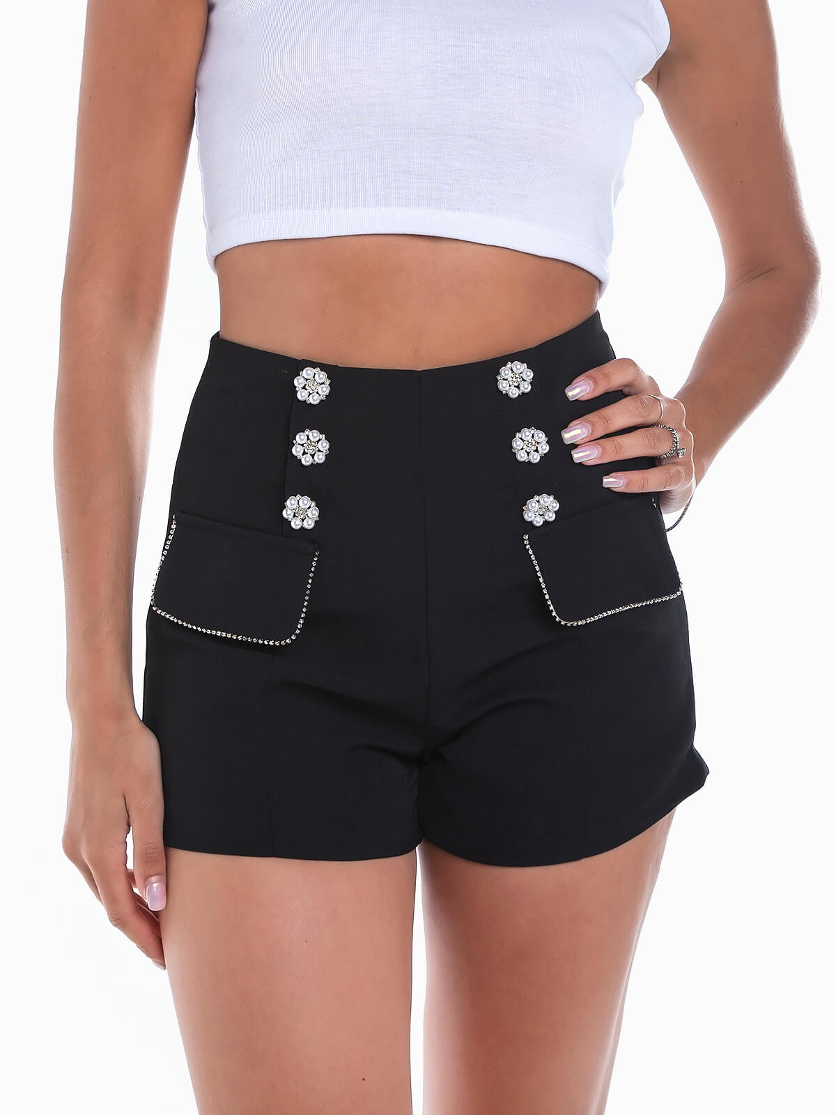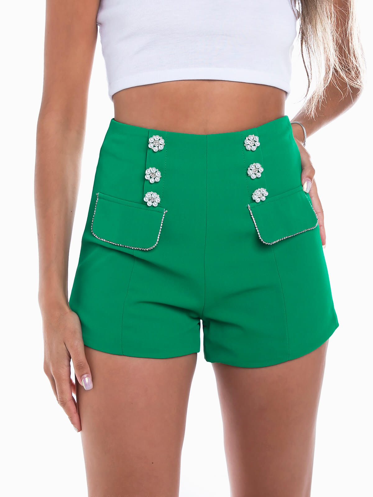 Calções curtos com botões de pérolas e palas decorativas. Calções de cintura alta com aperto posterior de fecho éclair oculto na costura.