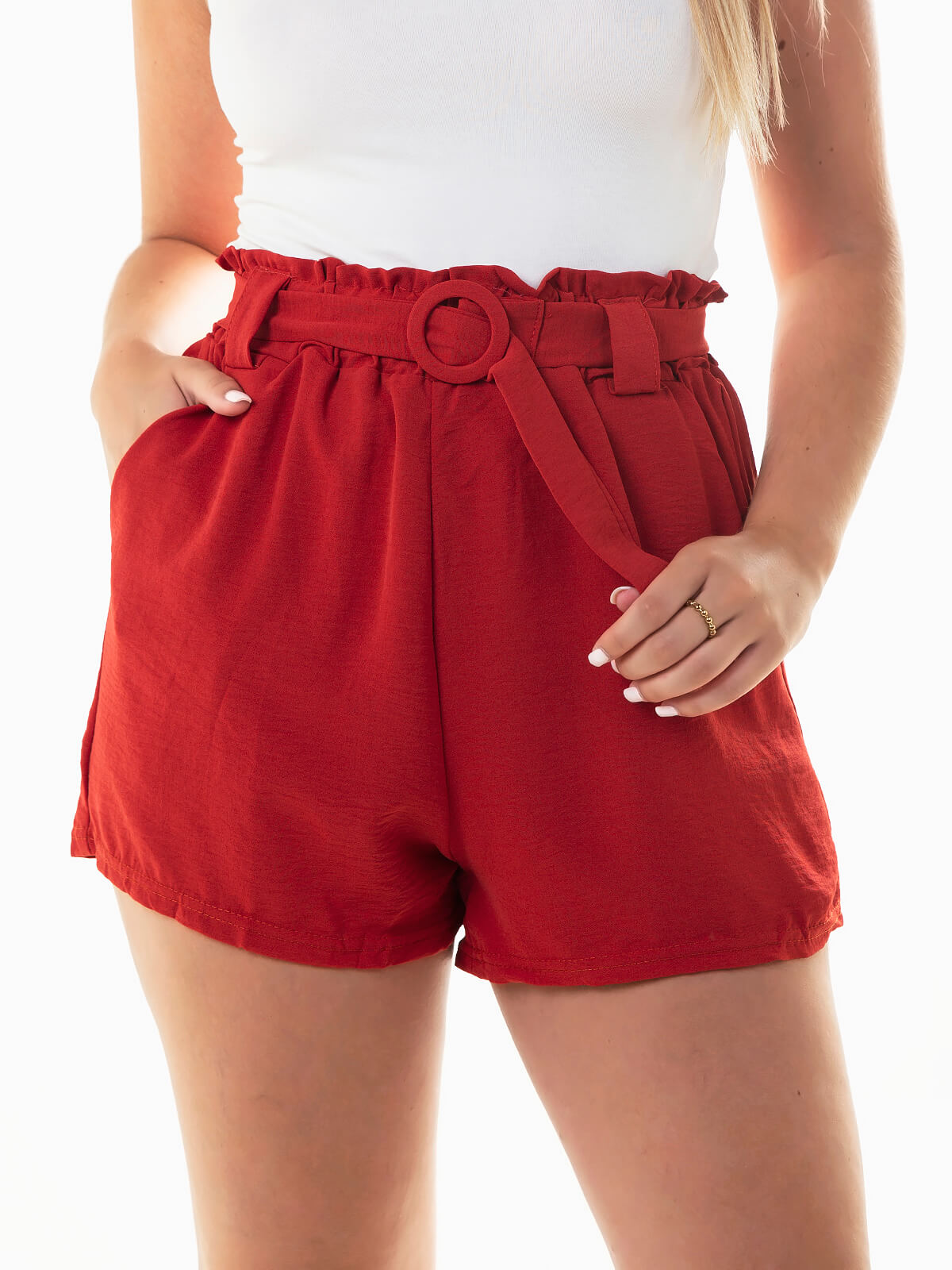 Calções curtos com cinto de fivela redonda removível. Calções fluídos para senhora com cintura alta paperbag. Bolsos laterais.