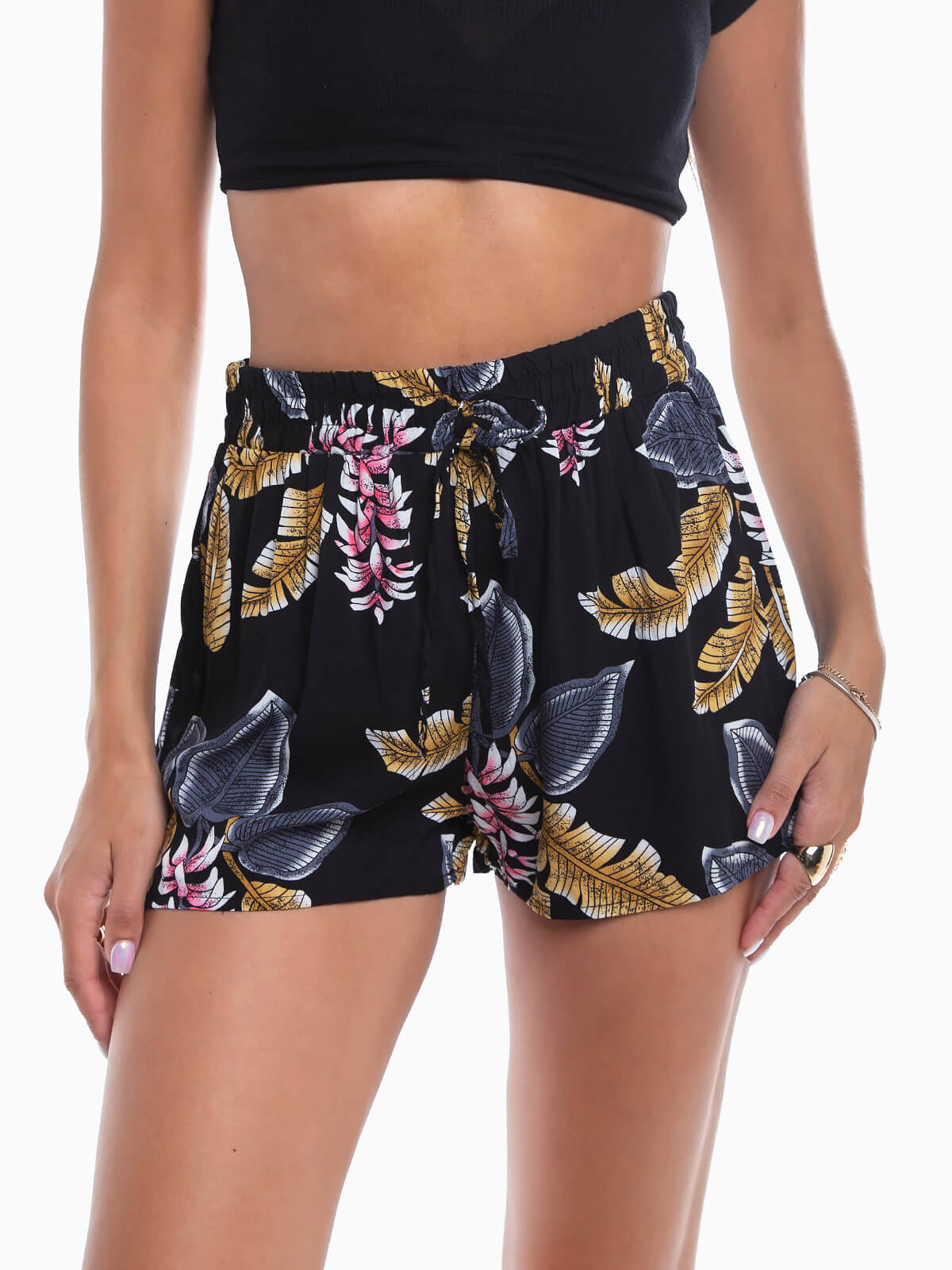 Calções curtos com estampado de folhas. Calções para senhora com cintura alta elástica e cordão para laço.