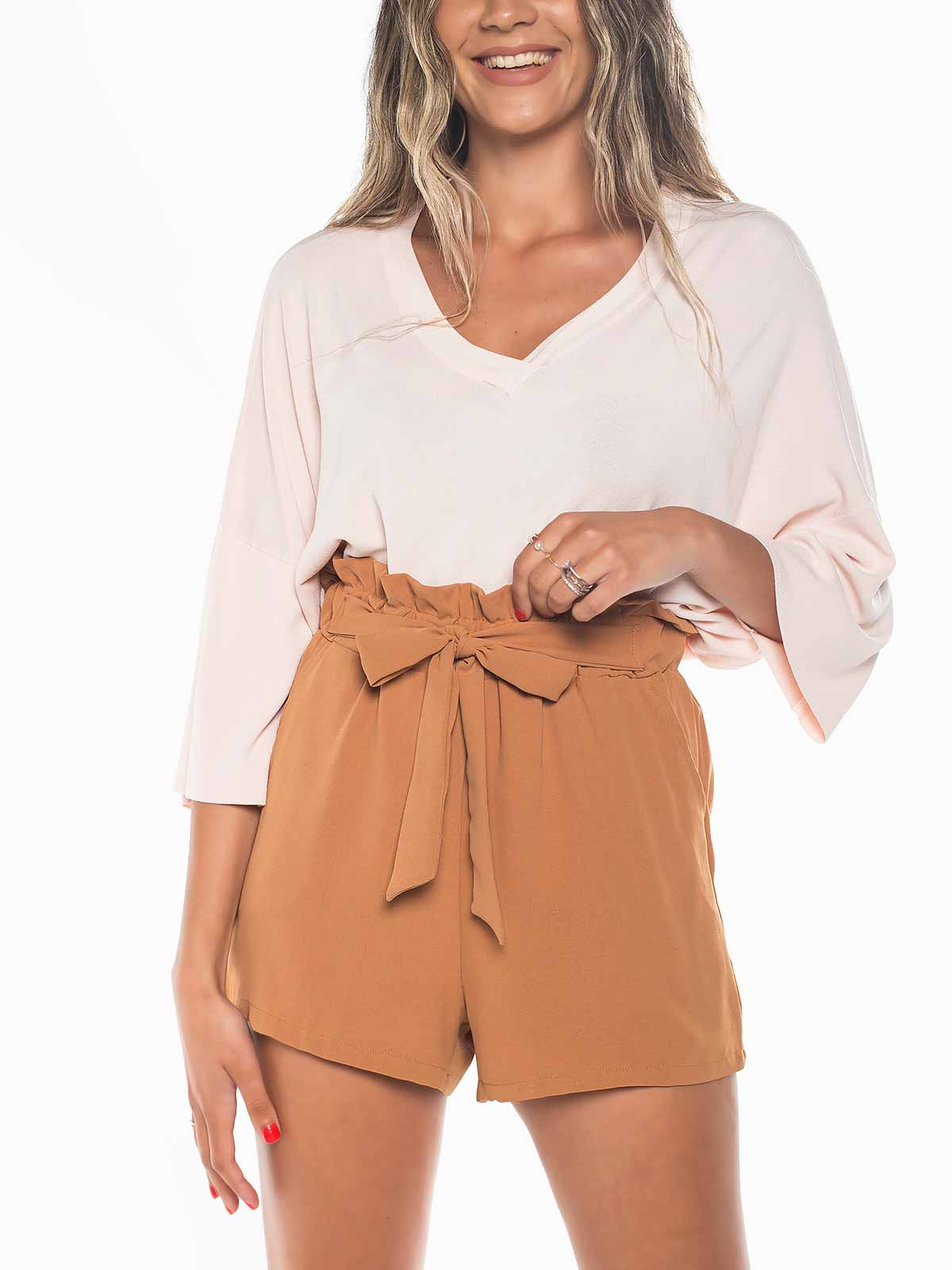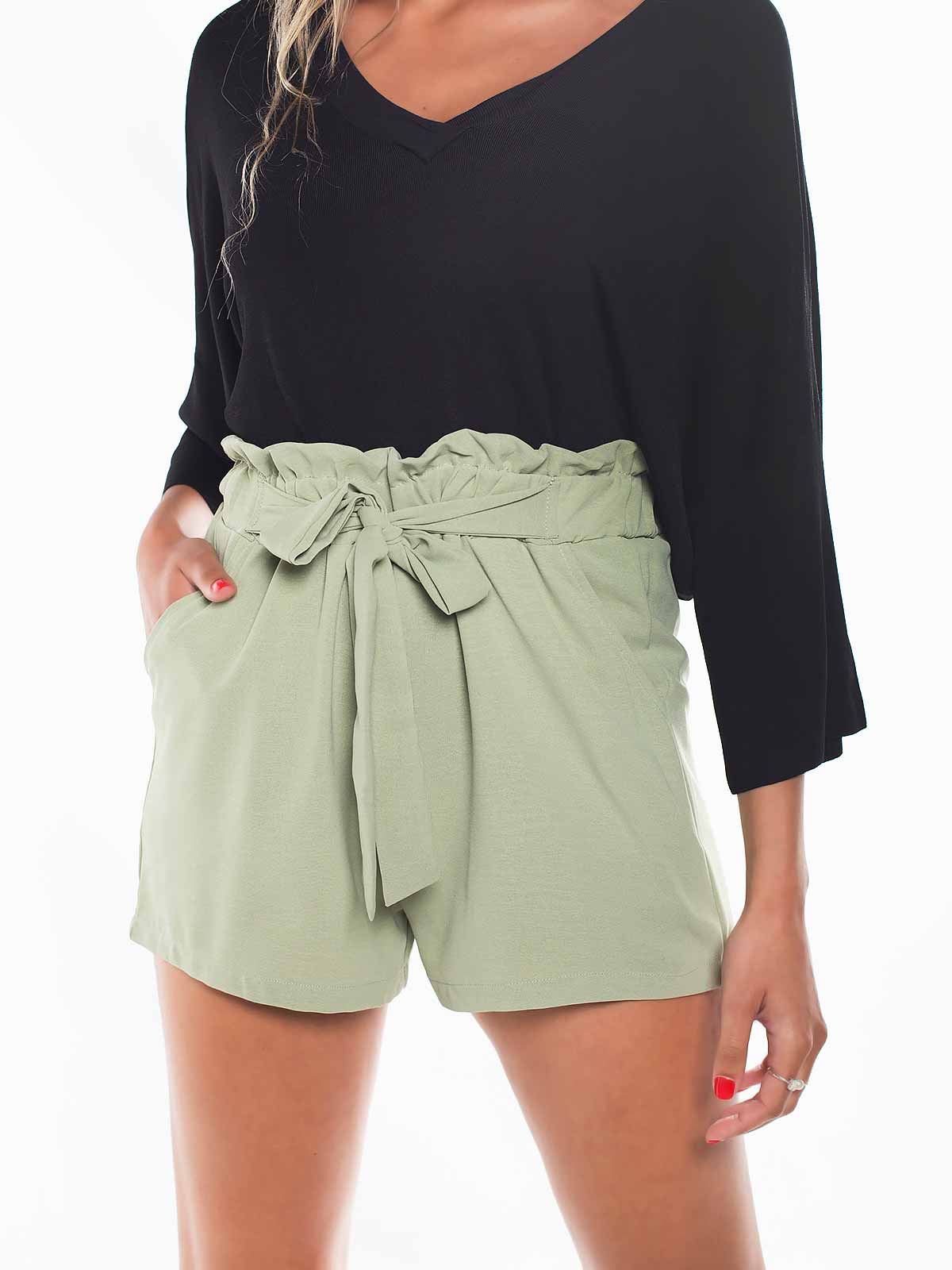 Calções curtos cintura elástica com aperto de laço. Calções femininos com bolsos laterais.