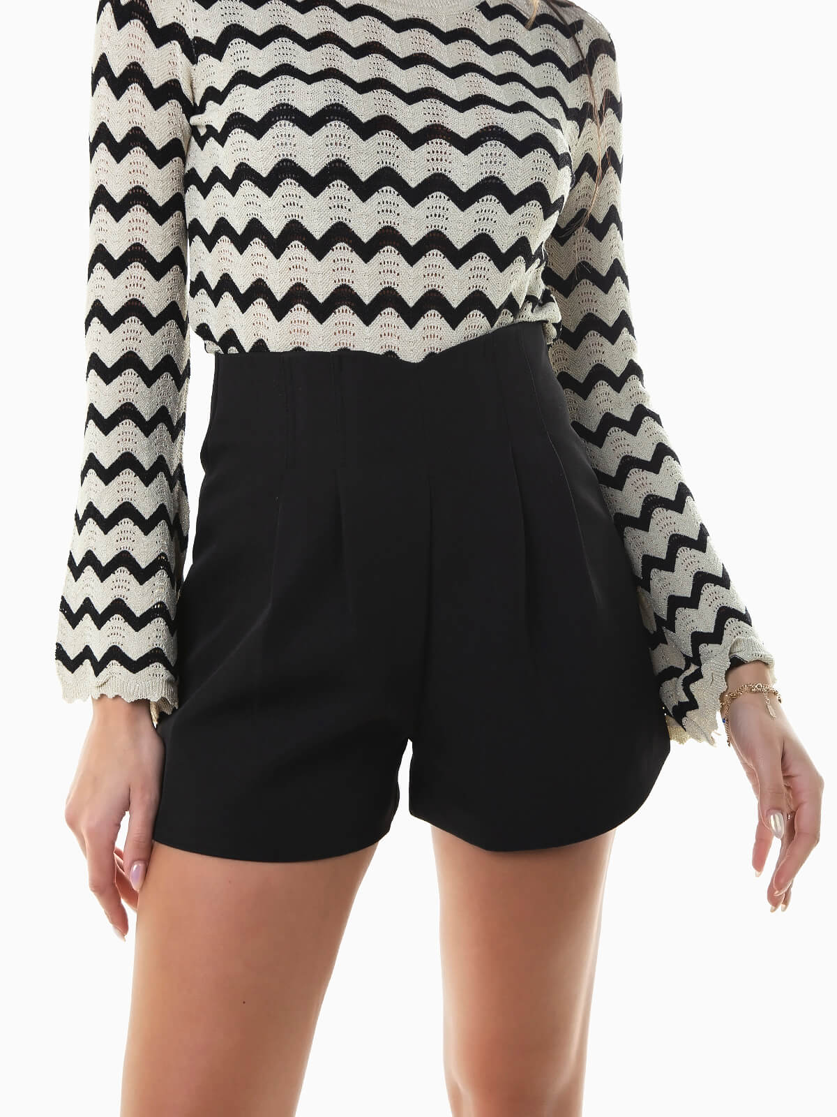 Calções curtos com pormenor de pinças. Calções elegantes de cintura alta com aperto posterior de fecho éclair oculto na costura. Interior forrado.