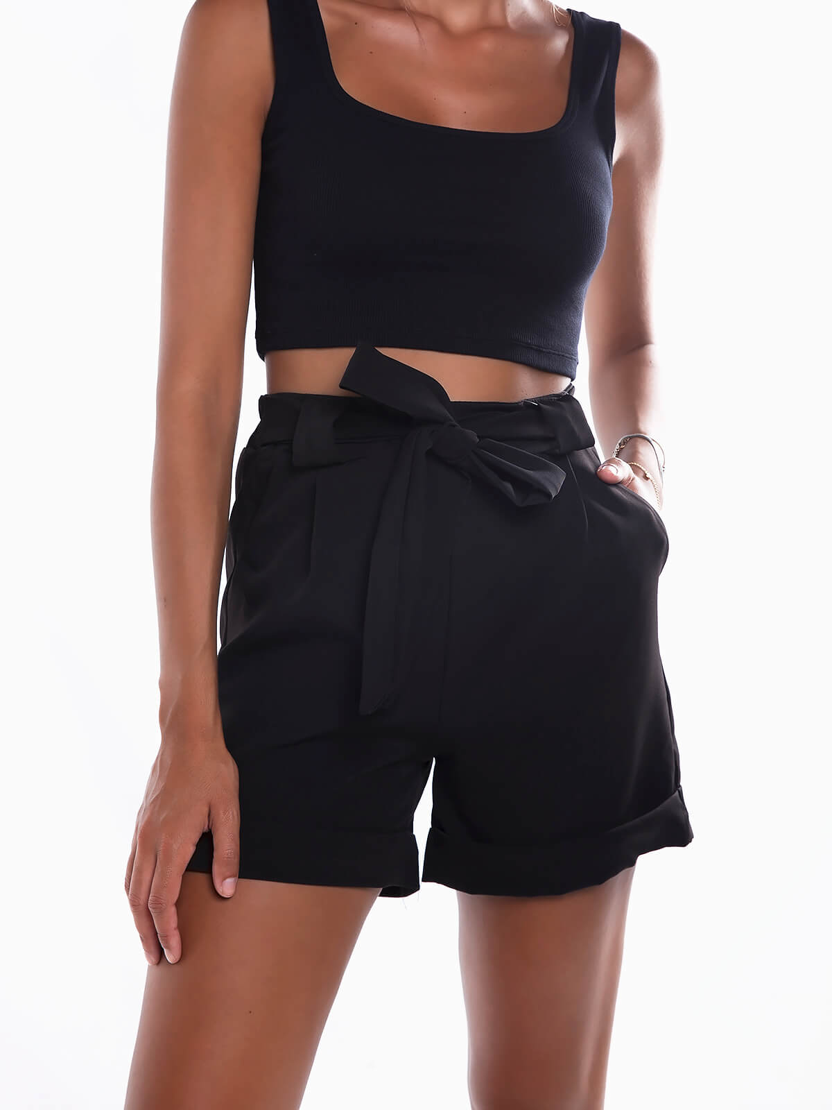 Calções curtos de cintura alta elástica com cinto no mesmo tecido para laço. Calções dobrados na base e pormenor de pregas na frente. 2 bolsos laterais.