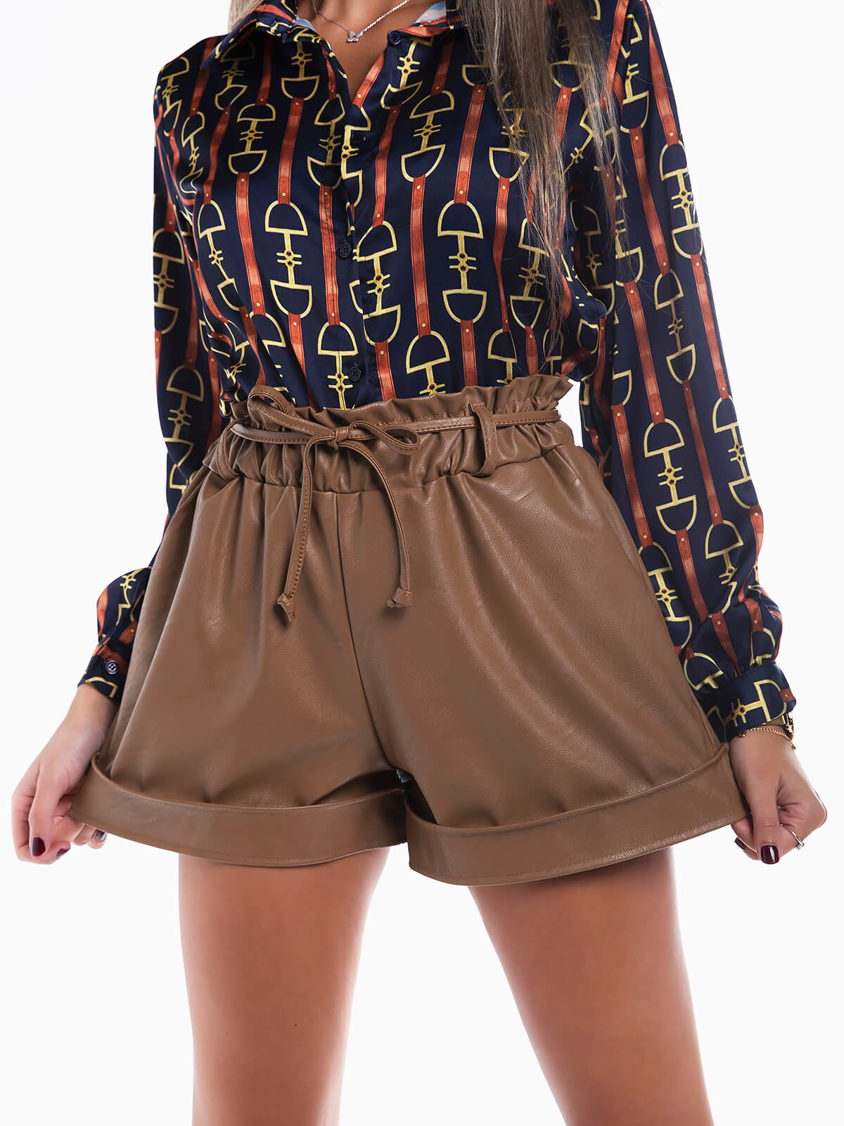 Calções curtos em pele sintética com cintura franzida para efeito de folho. Calções com presilhas e cordão para laço. Bolsos faca dos lados.