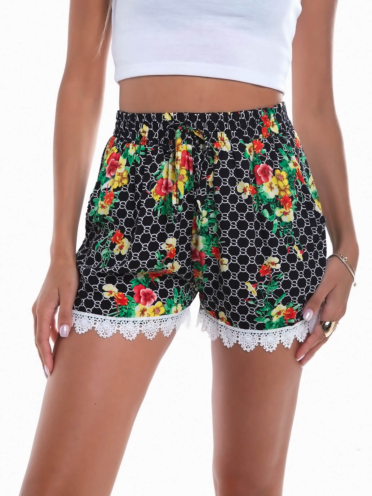 Calções curtos com estampado de flores e encaixe de crochet na base. Calções de cintura alta elástica com cordão para laço. 2 bolsos.