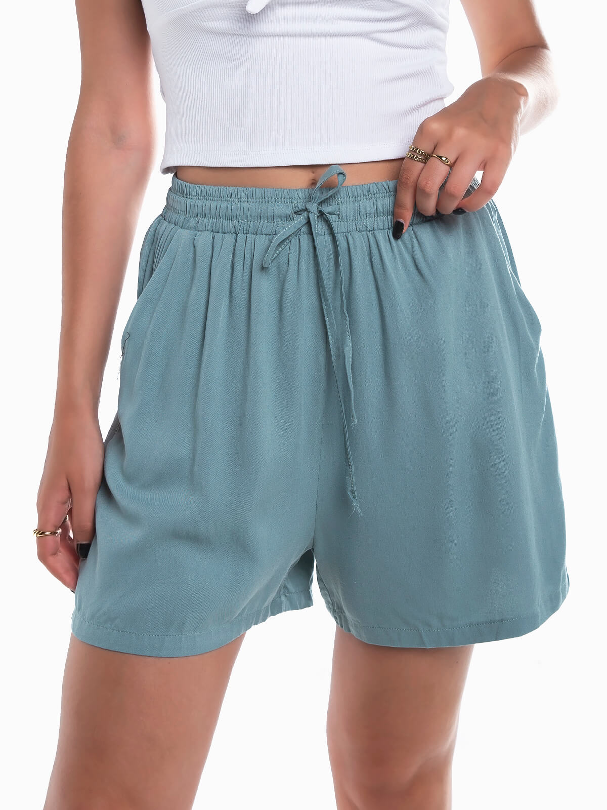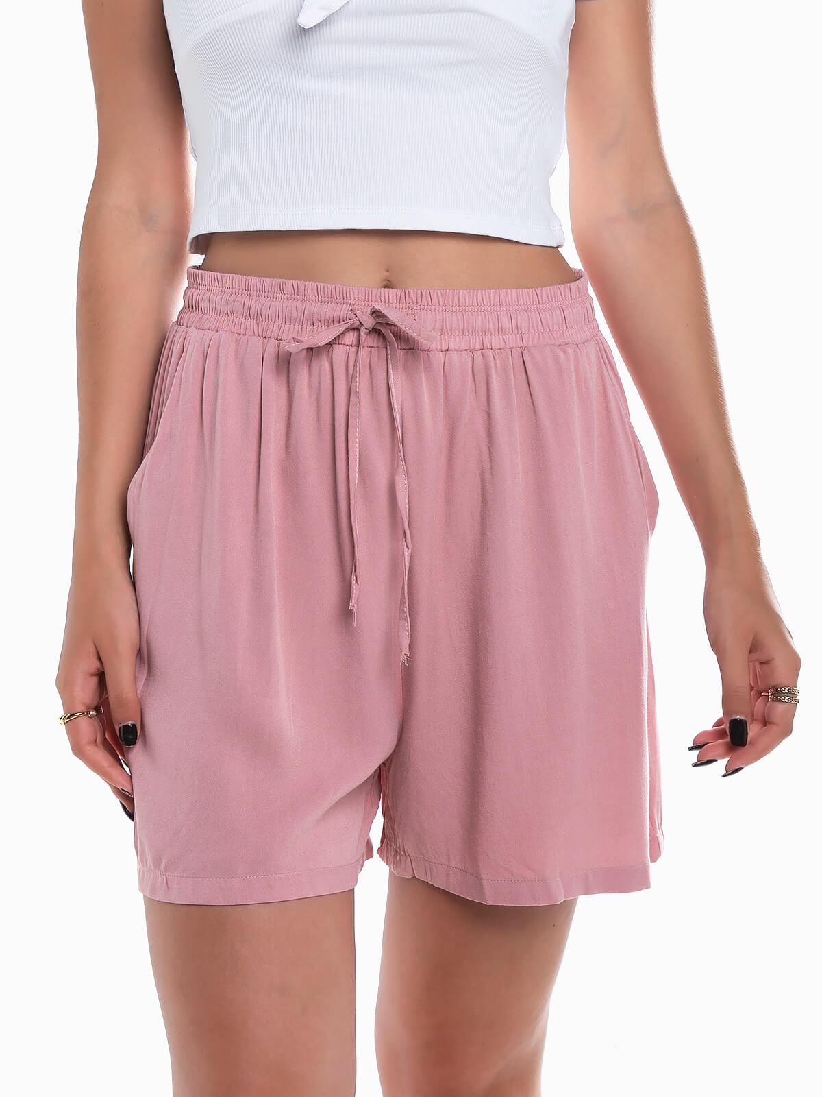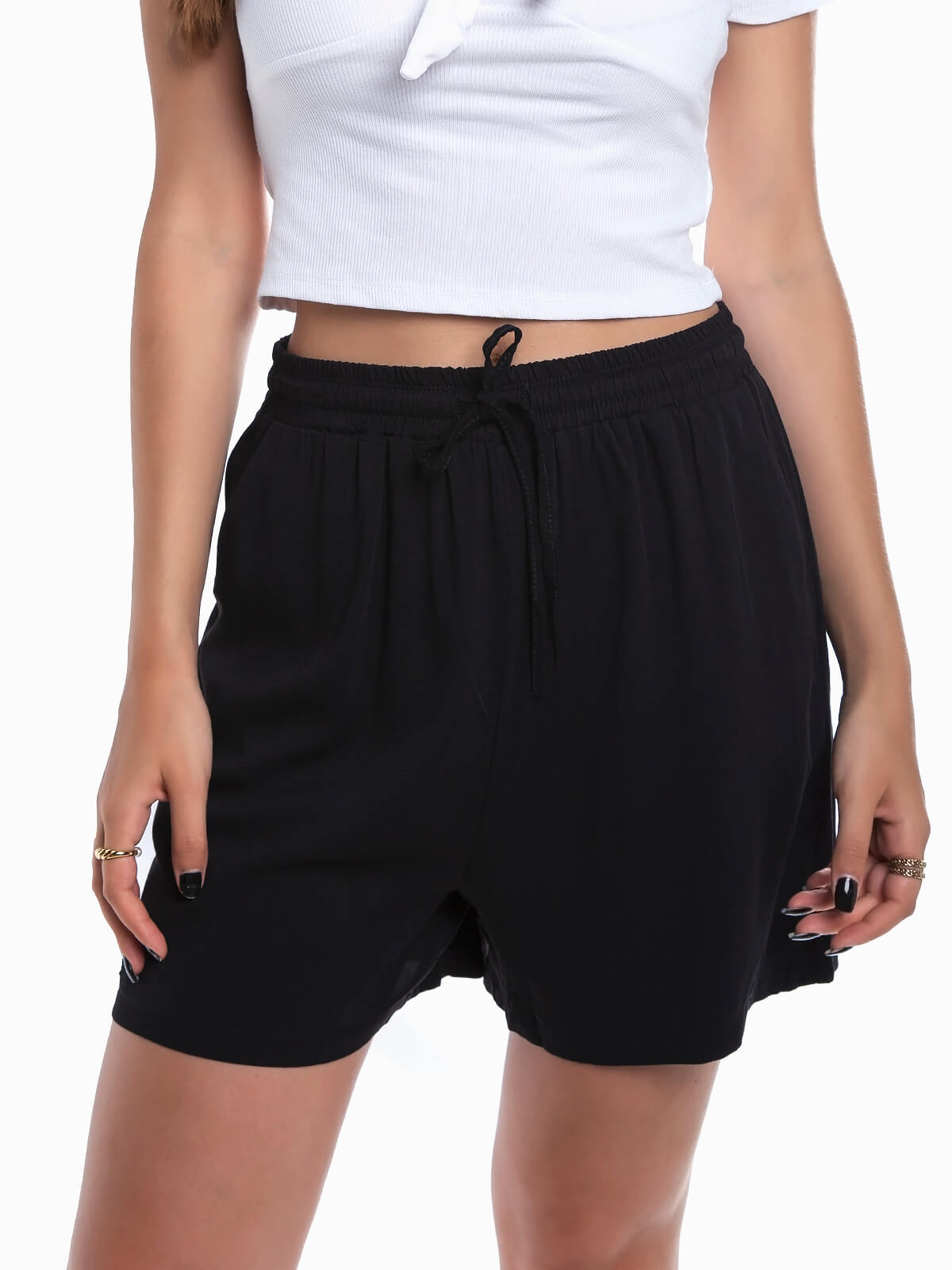 Calções curtos fluídos com cintura alta elástica. Calções com 2 bolsos laterais e cordão para laço.