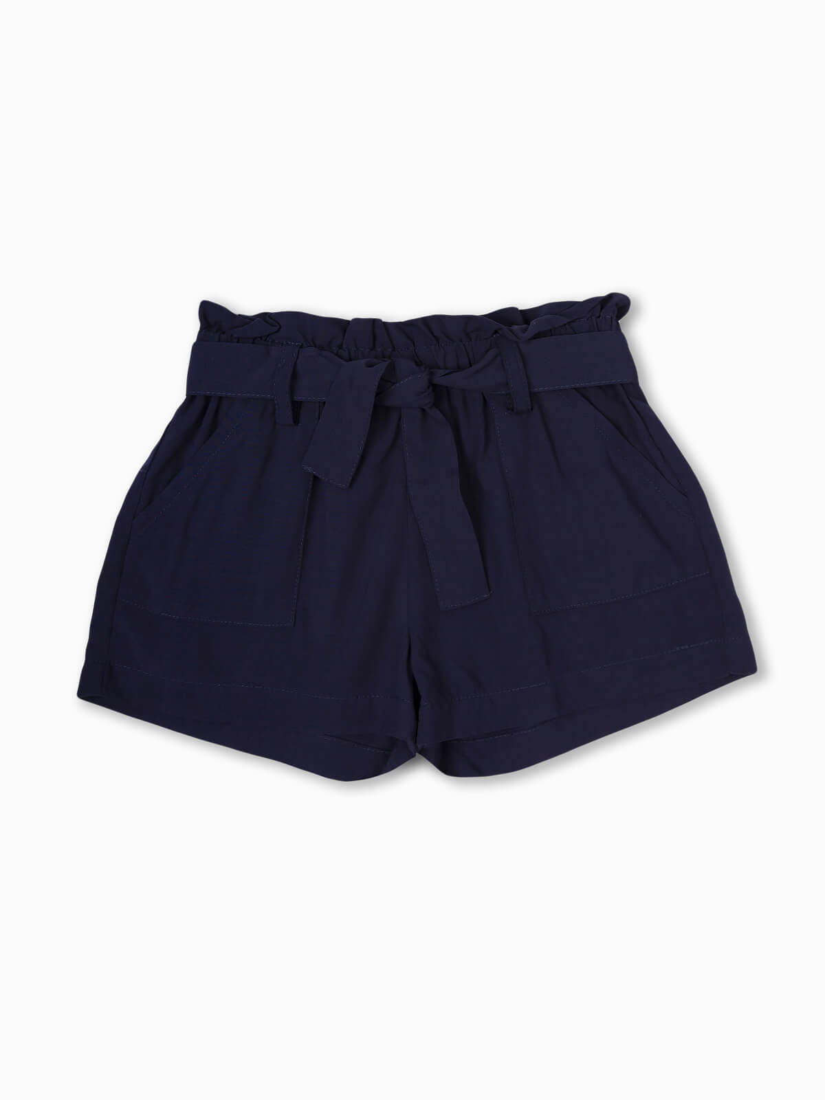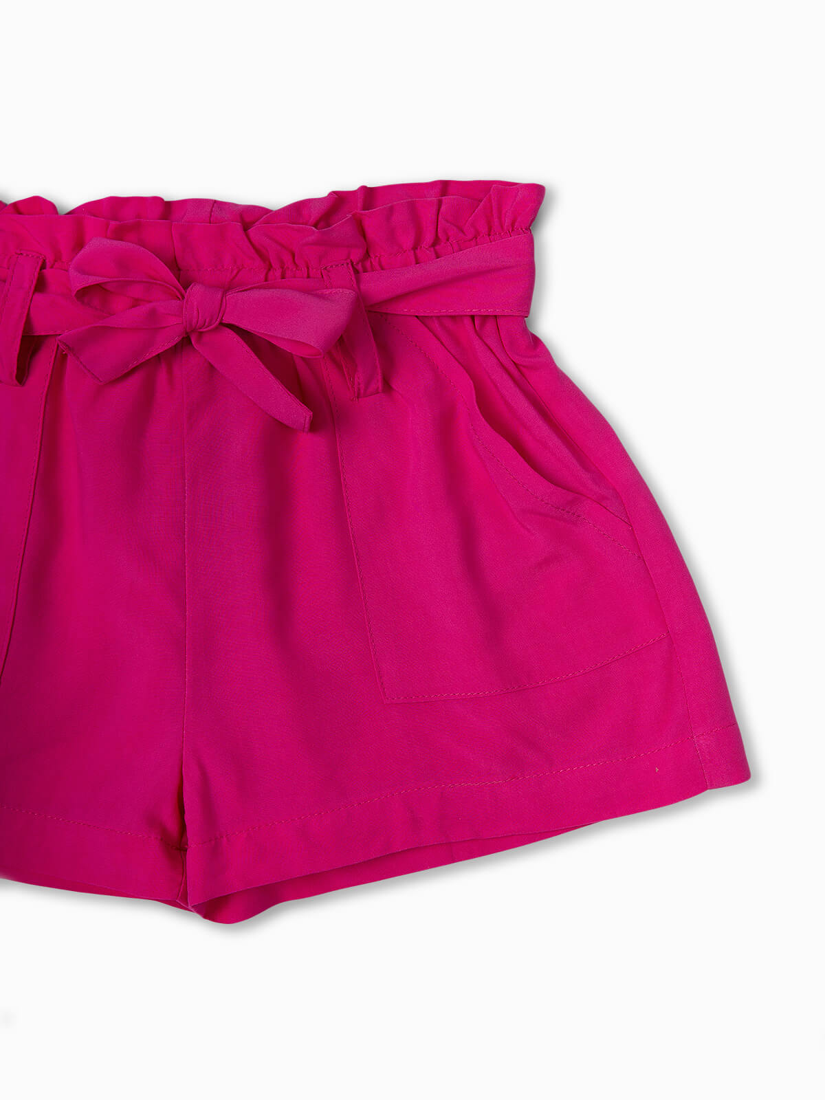 Calções curtos fluídos para menina. Calções com cintura elástica paperbag e cinto no mesmo tecido para ajustar. 2 bolsos.