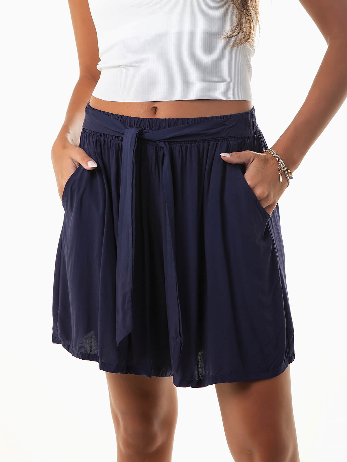 Calções curtos largos com tecido para laço. Calções para senhora com cintura alta elástica e 2 bolsos.