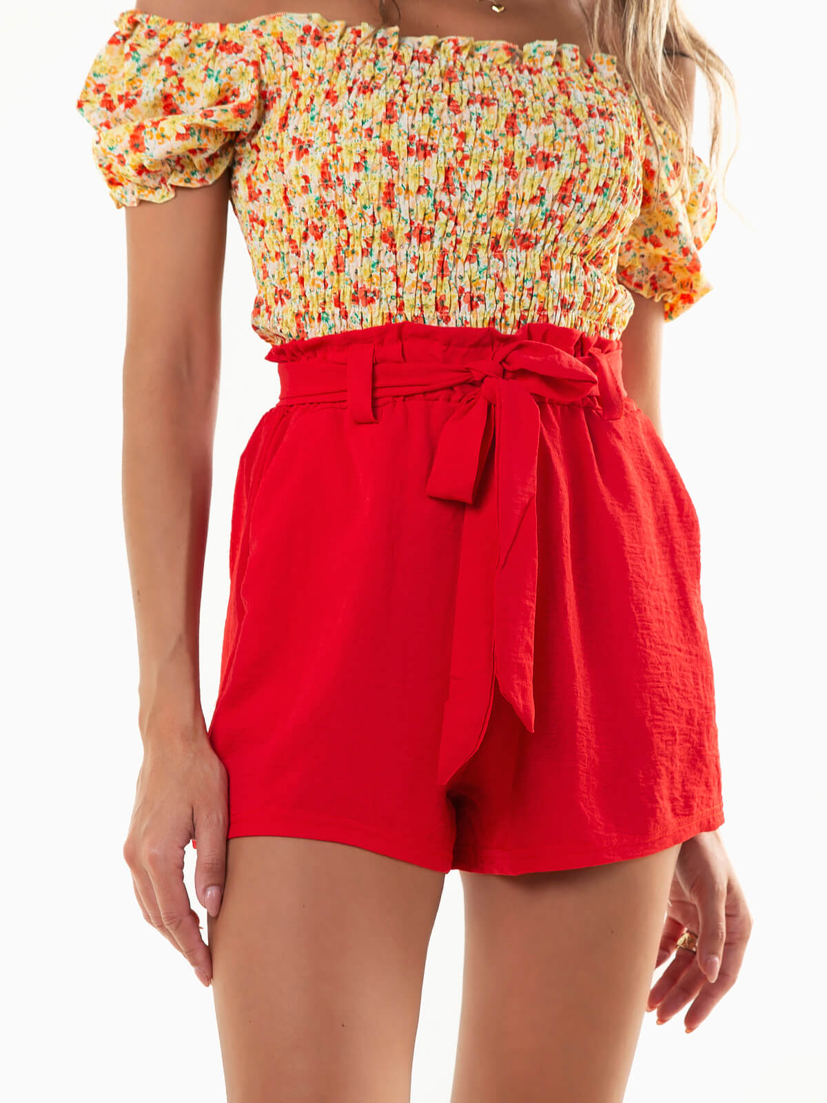 Calções curtos com cintura alta paperbag e cinto no mesmo tecido para laço. Calções fluídos com 2 bolsos.