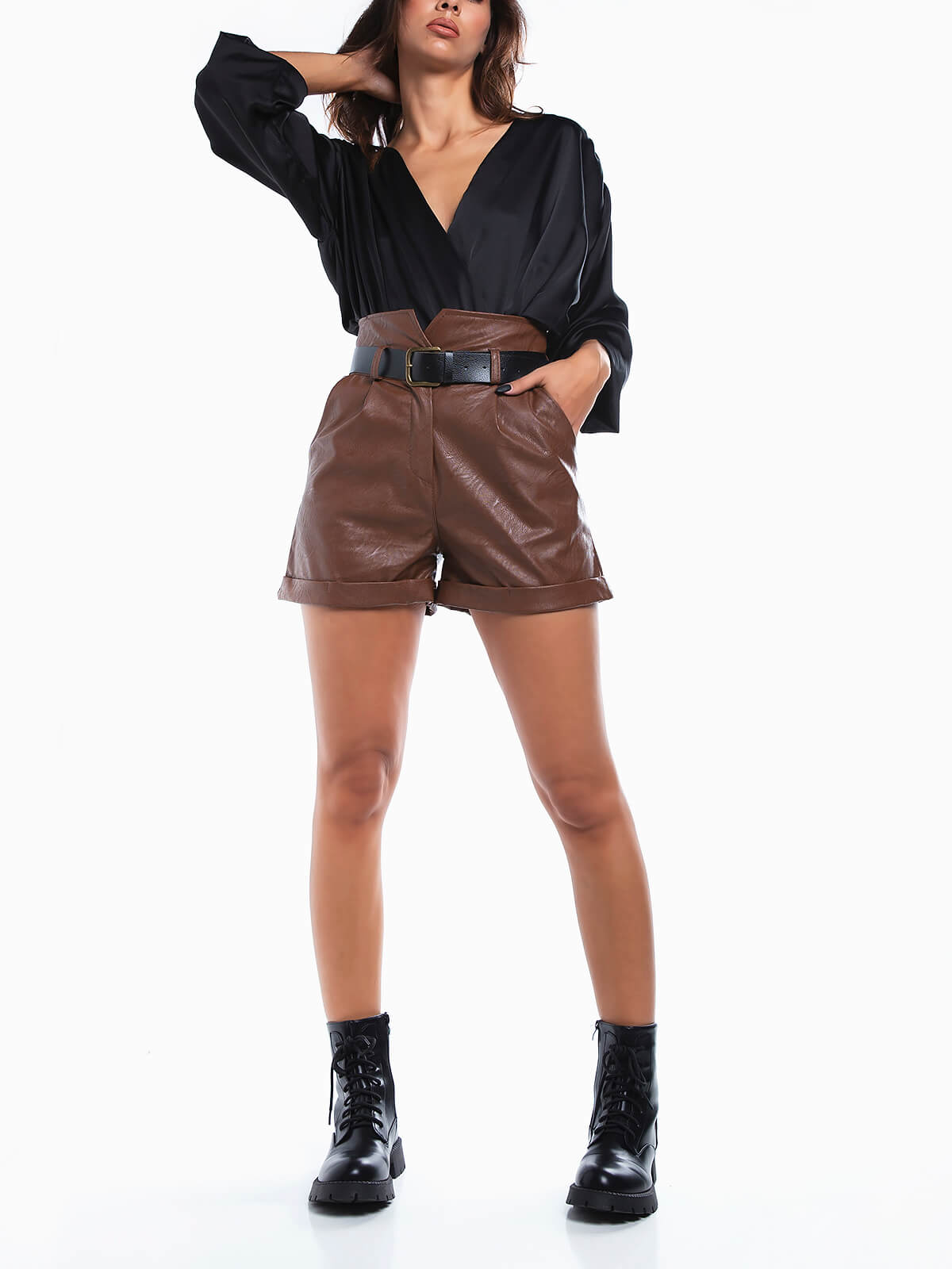 Calções curtos em pele sintética com pregas. Cintura alta com cinto de fivela. Bolsos de lado.
