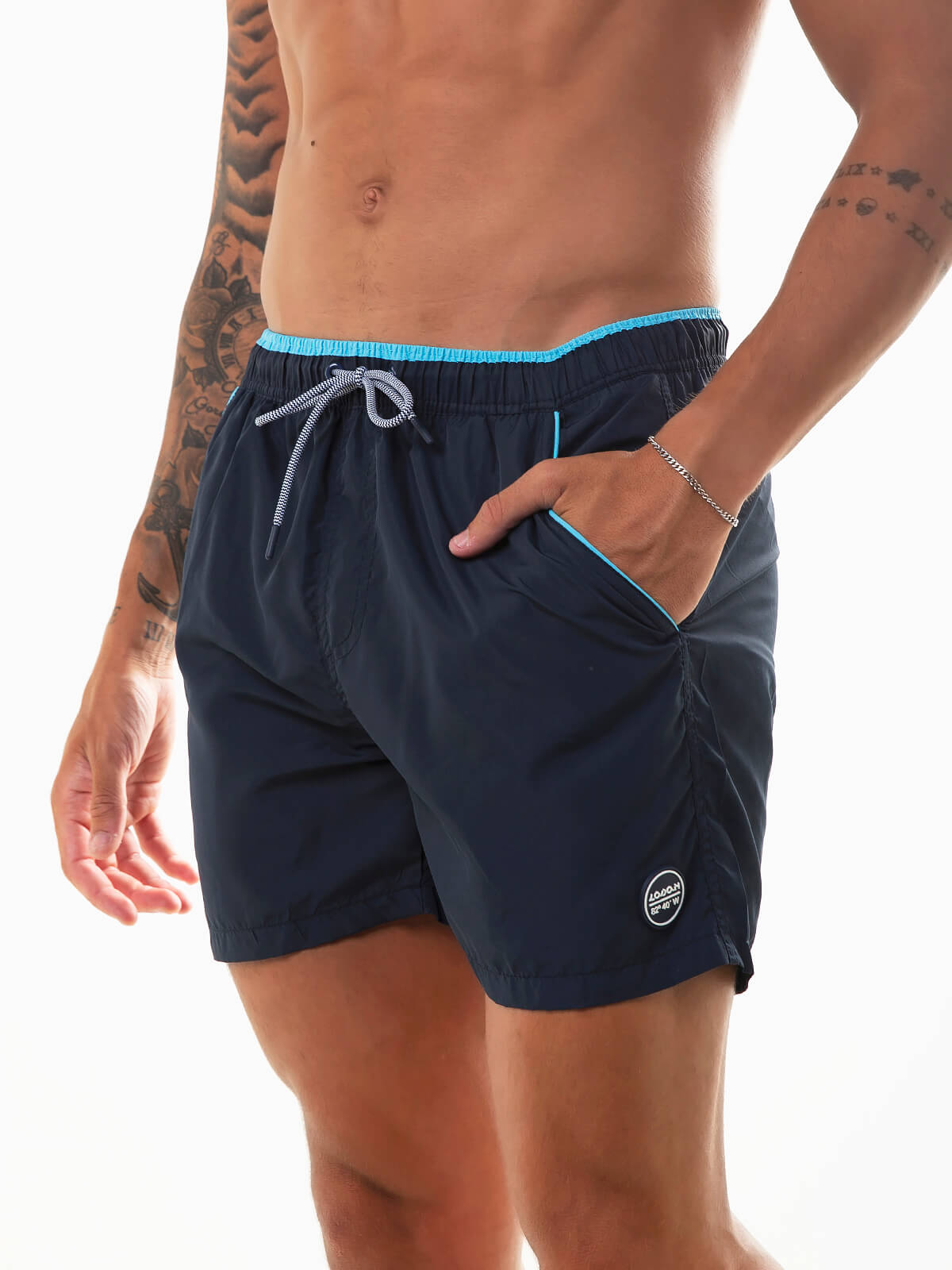 Calções de banho lisos com símbolo em borracha. Calções em tecido de secagem rápida com cintura elástica e cordão para ajustar. 2 bolsos laterais e 1 atrás com velcro. Forro interior respirável.