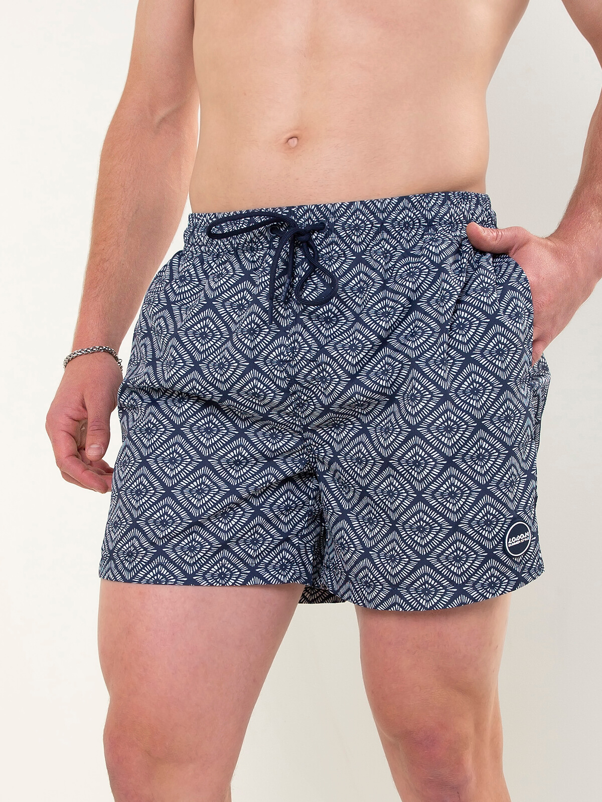 Calções de banho em tom azul com estampado geométrico. Modelo com cintura elástica para maior conforto, dois bolsos laterais e bolso posterior. Interior com forro para melhor ajuste e praticidade.