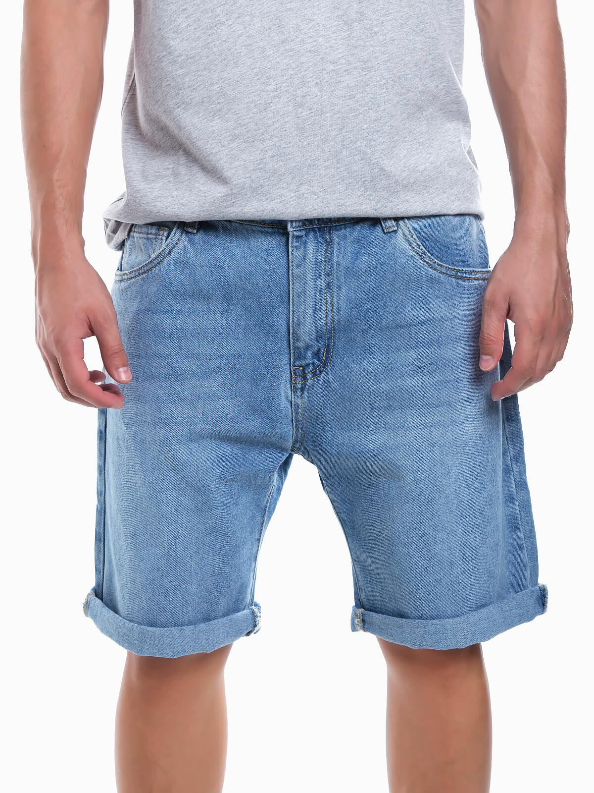 Calções de ganga de lavagem azul claro para homem. Calções com 5 bolsos. Aperto de fecho éclair e botão.