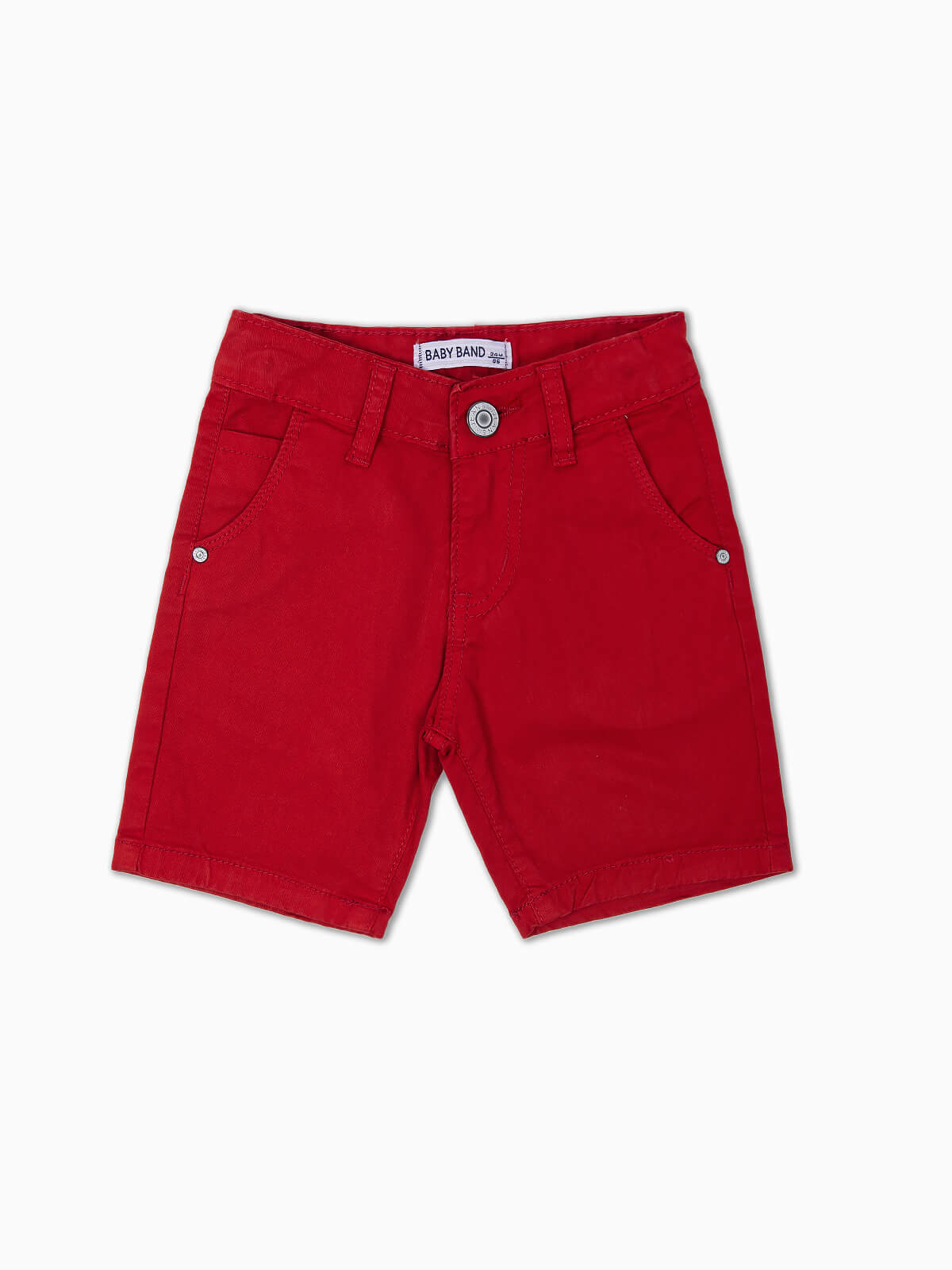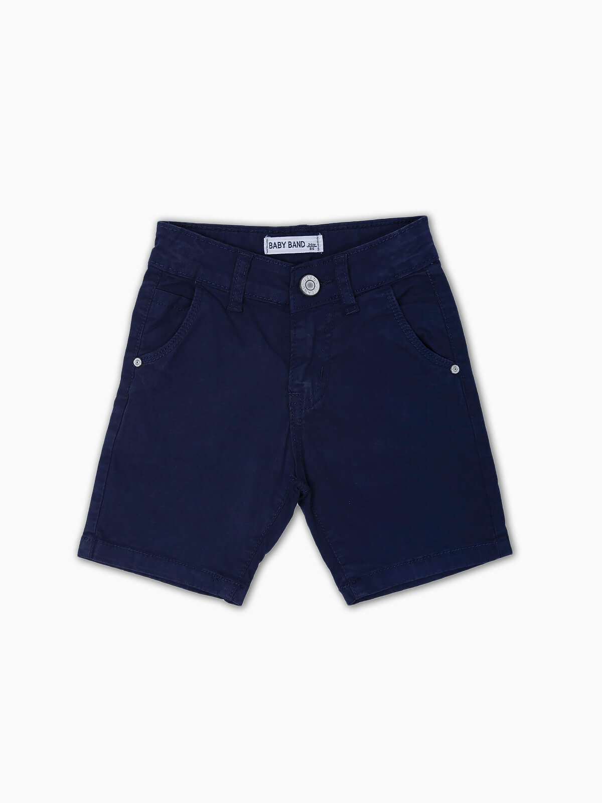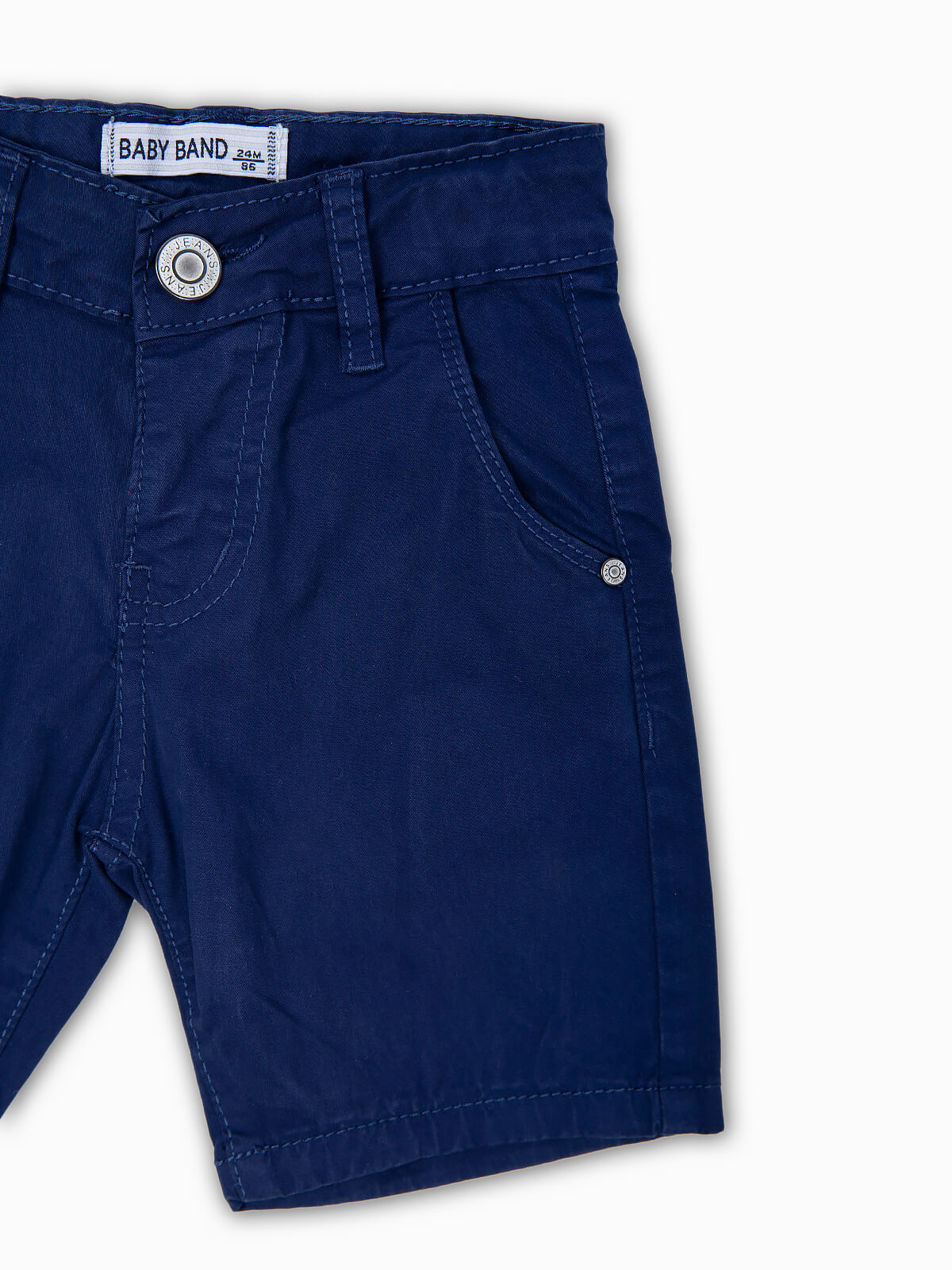 Calções de sarja com elasticidade para bebé menino. Ajustador na cinta. 5 bolsos. Aperto de fecho éclair e botão.