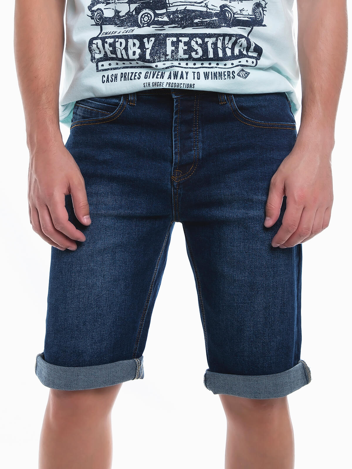 Calções denim elásticos com lavagem azul escuro. Calções ganga com dobra na base. 5 bolsos. Aperto fecho éclair e botão.