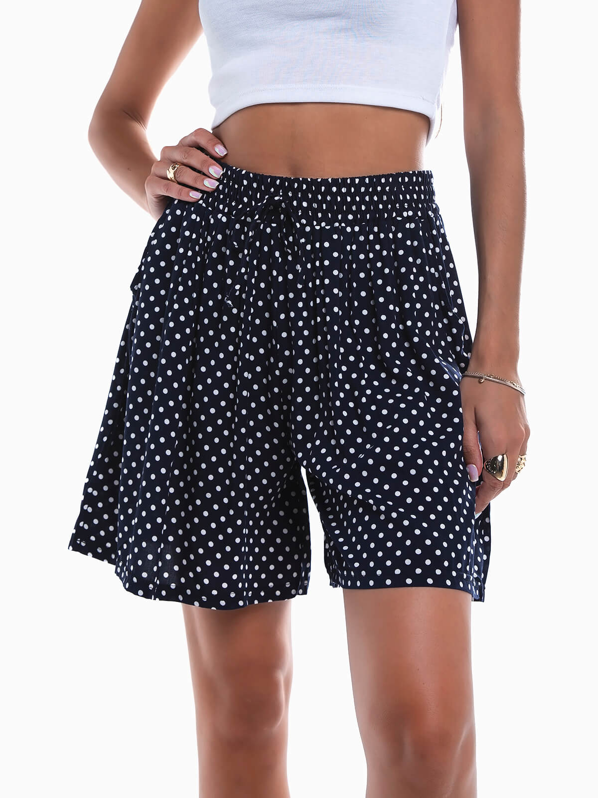Calções fluídos com estampado de bolas para senhora. Bermudas com cintura alta elástica e cordão para laço. 2 bolsos.