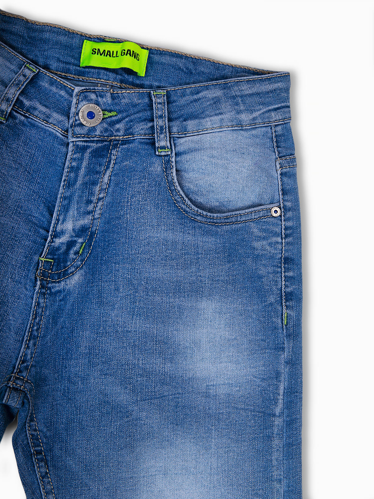Calções de ganga de lavagem azul claro para menino. Cintura elástica. 5 bolsos. Aperto de fecho éclair e botão.