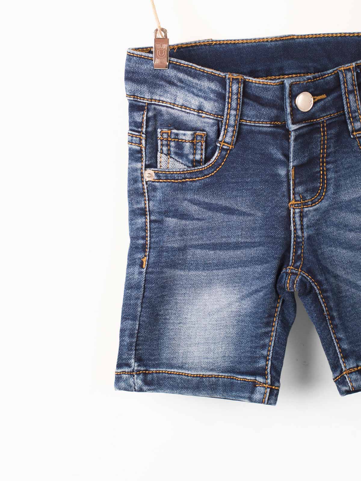 Calções de ganga de lavagem escura manchada para bebé rapaz. Calções denim com elasticidade. 5 bolsos. Aperto de fecho éclair e botão.