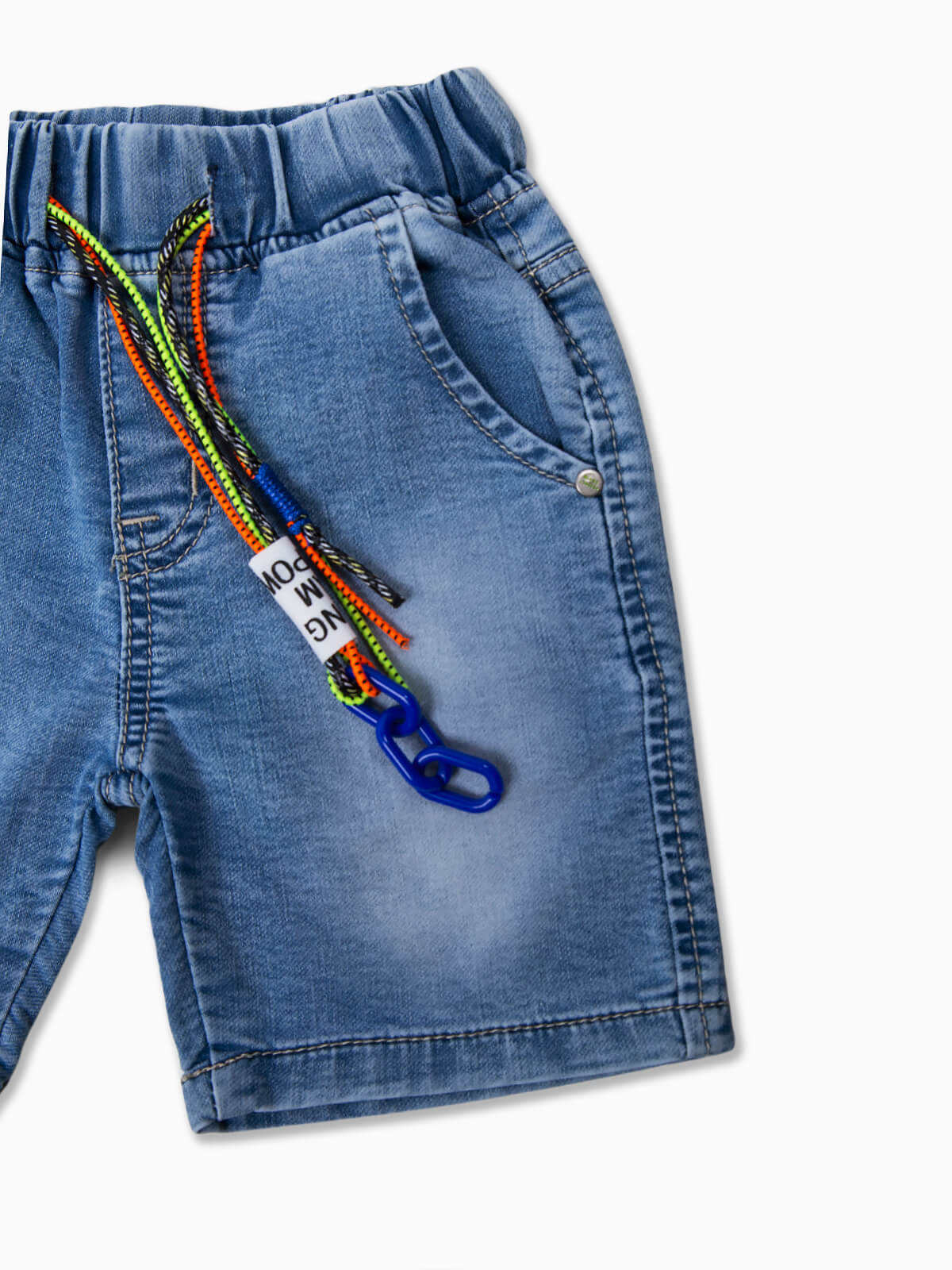 Calções de ganga de lavagem azul claro para bebé menino. Calções de cintura elástica com ajustador e cordão colorido. 5 bolsos. Braguilha falsa.