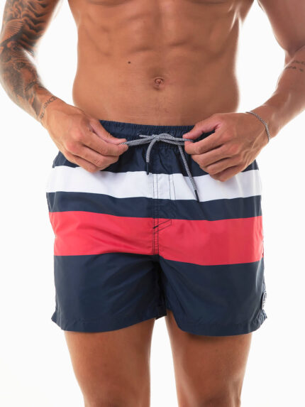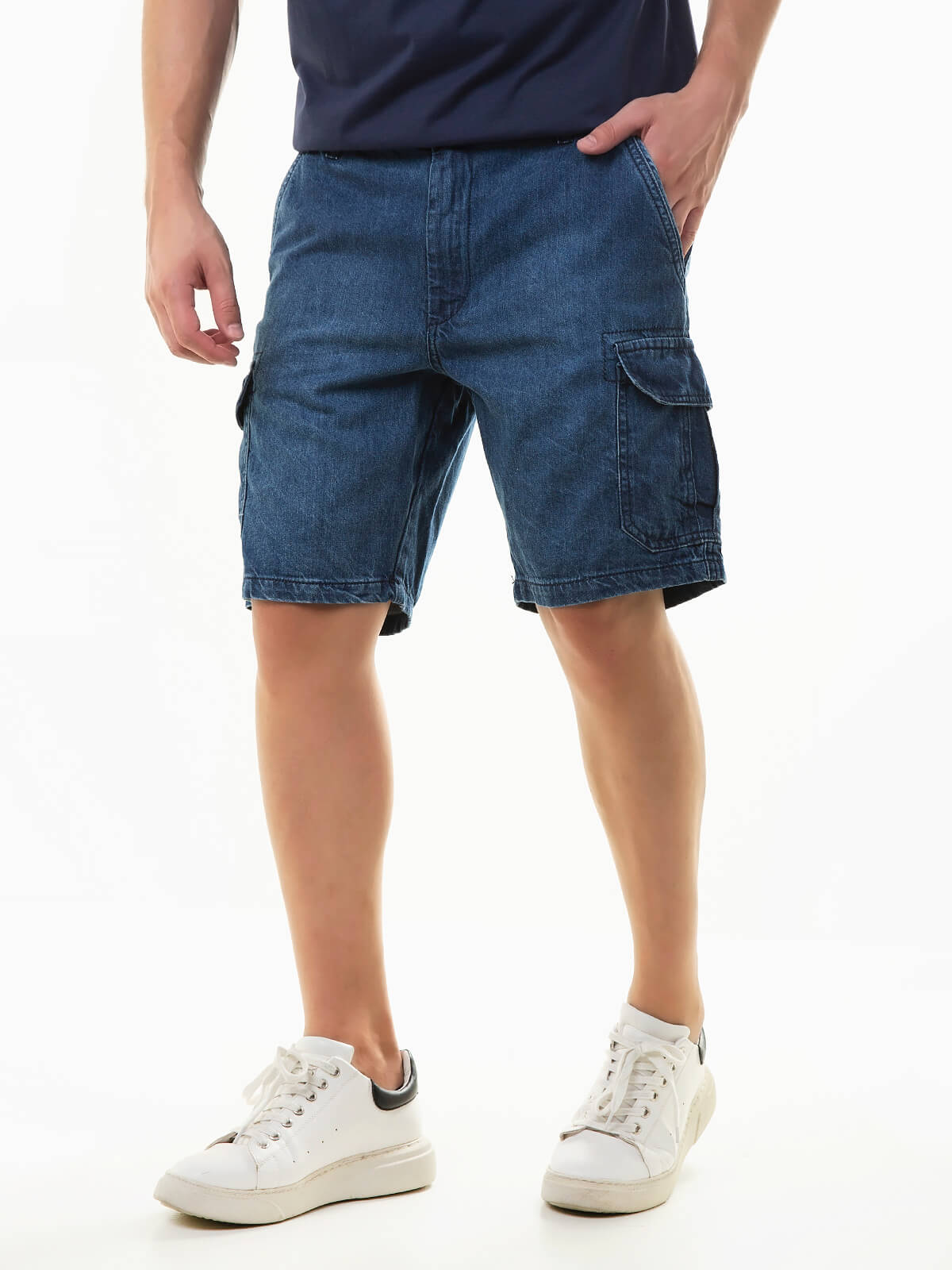 Calções de ganga estilo cargo para homem. Calções confortáveis com lavagem azul escuro e 6 bolsos. Aperto fecho éclair e botão.