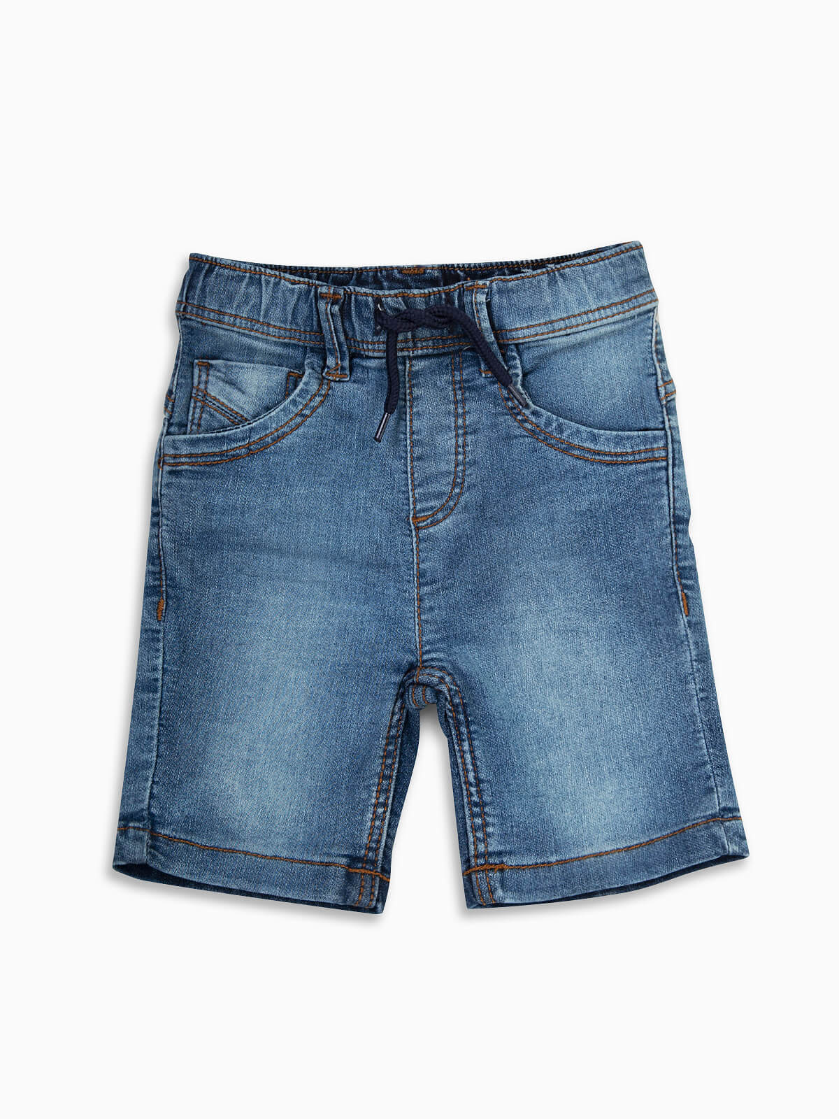 Calções de ganga com cintura elástica e cordão para laço. Calções para bebé menino com lavagem azul claro. 4 bolsos. Ajustador no interior.