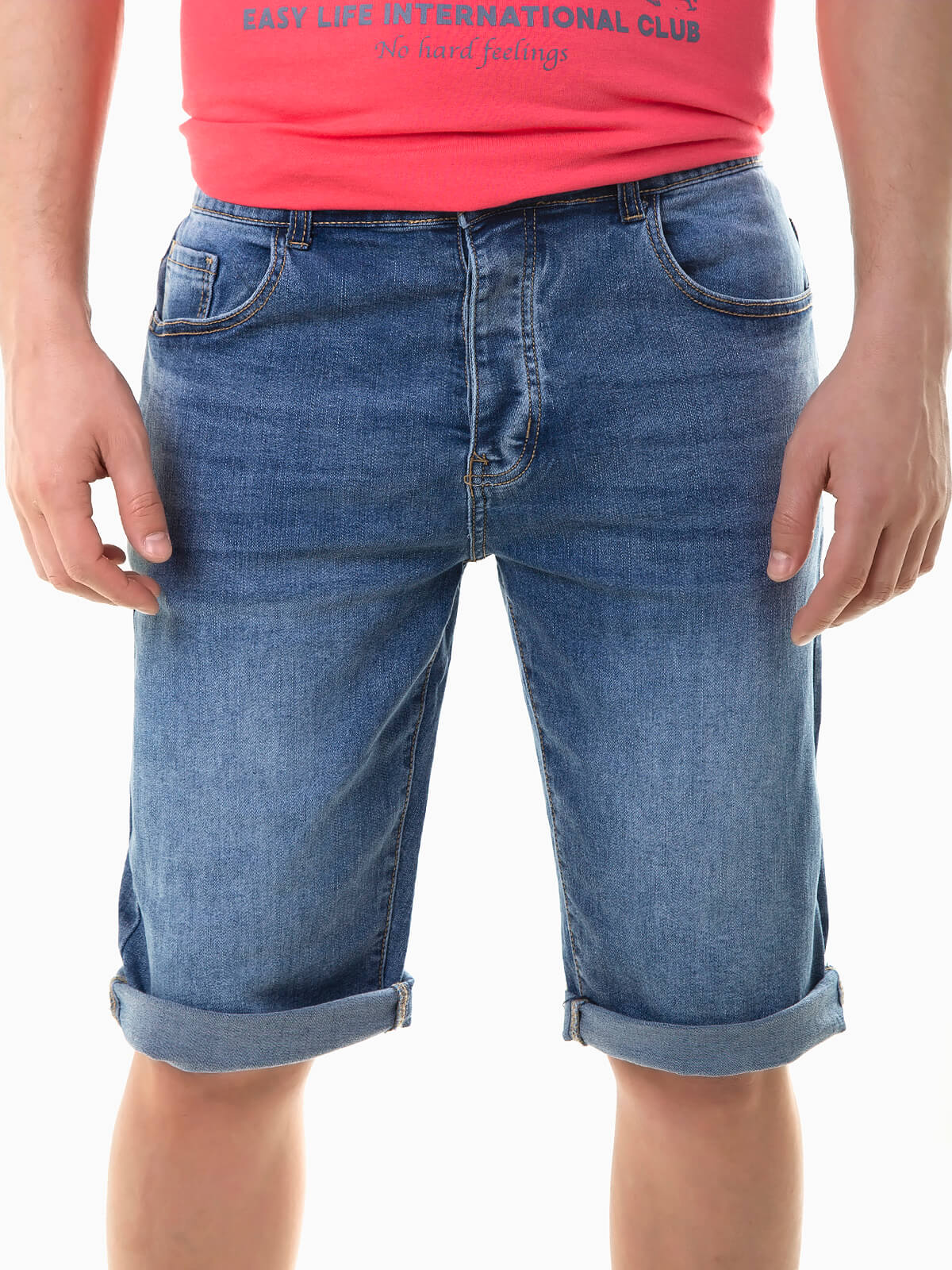 Calções ganga com aperto de botões. Bermudas elásticas com lavagem azul médio. 5 bolsos.